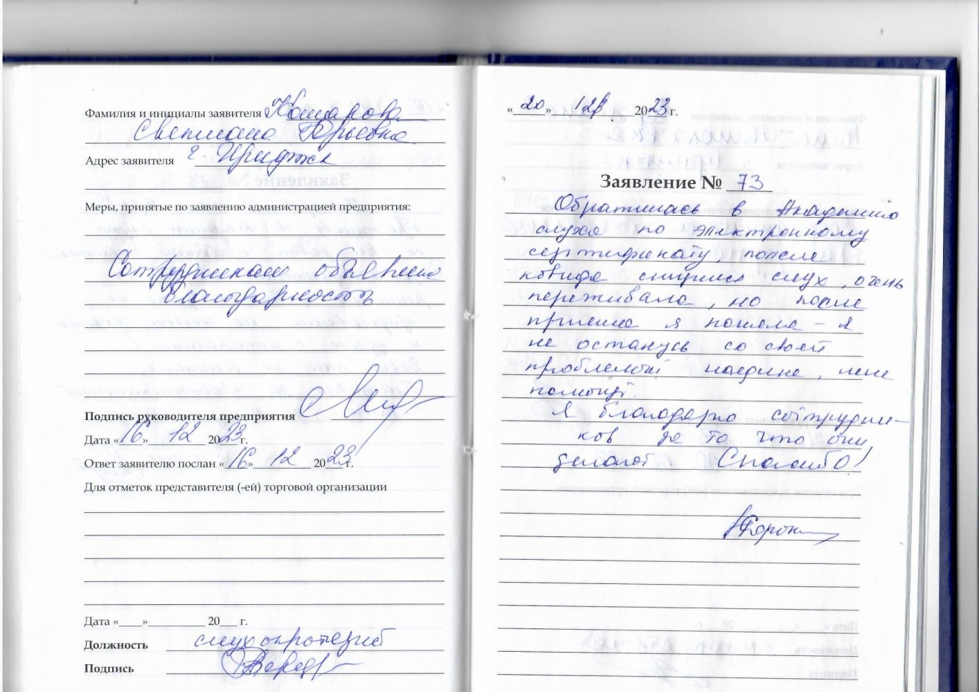 Я, Комарова Светлана Юрьевна, обратилась в Академию слуха со своей проблемой, пришла за консультацией, а ушла с решением проблемы. Даже не представляла, на сколько хорошо и удобно с аппаратами! Давно так не слышала. Благодарю за профессиональный приём, за Вашу работу. 16.12.2023 Подпись.