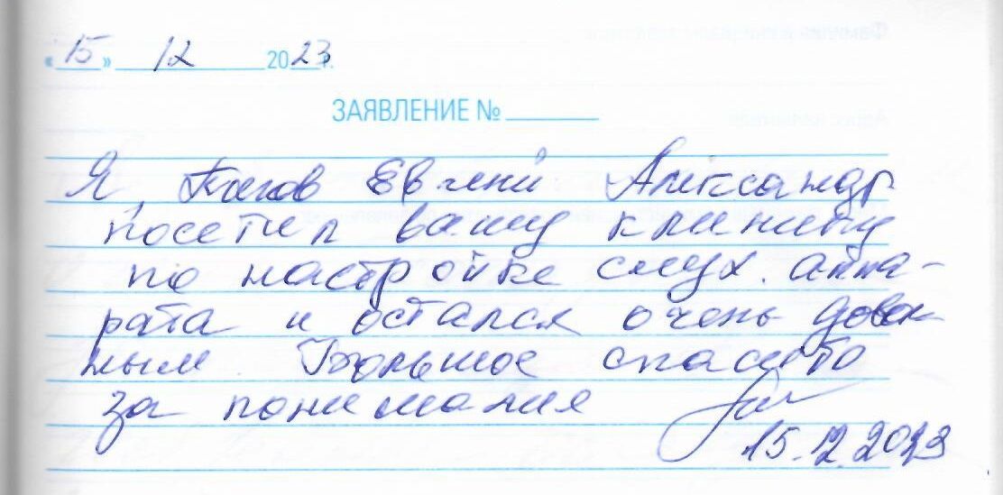 Я, Поегов Евгений Александрович посетил вашу клинику по настройке слухового аппарата и остался очень да вольным. Большое спасибо за понимание.