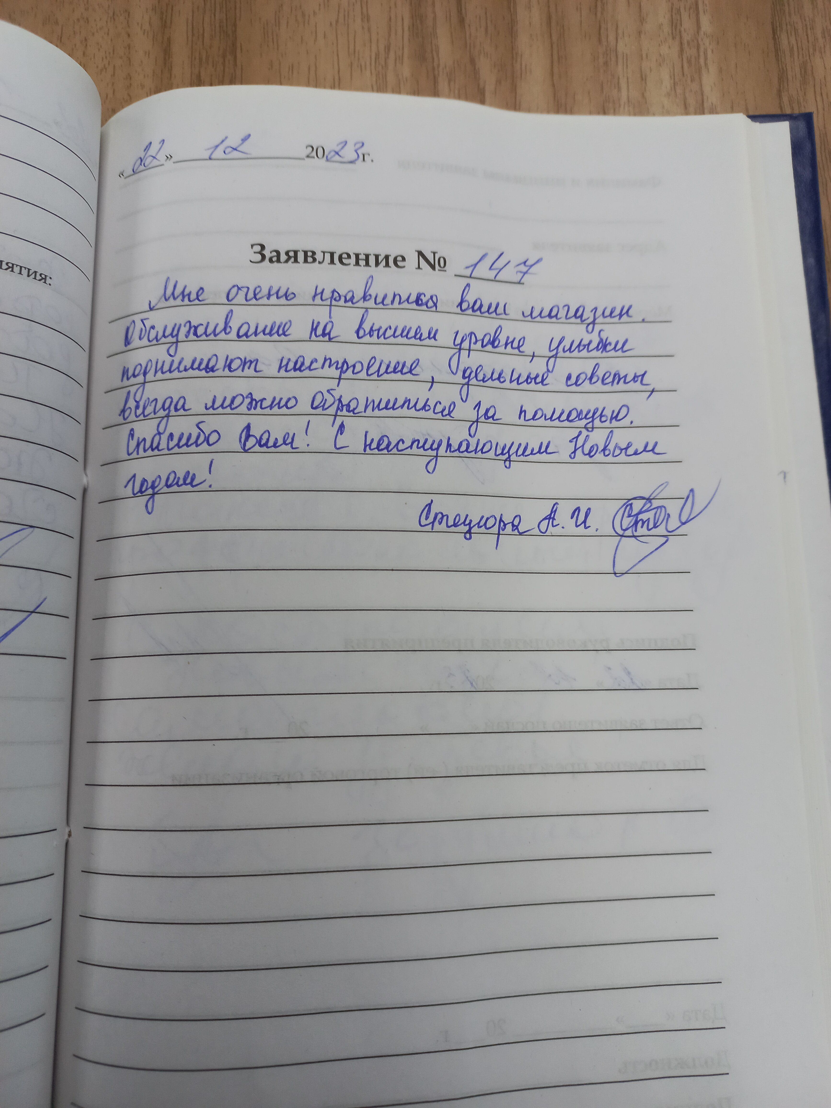 Мне очень нравится ваш магазин. Обслуживание на высшем уровне, улыбки поднимают настроение, дельные советы, всегда можно обратиться за помощью. Спасибо Вам! С Наступающим Новым Годом.