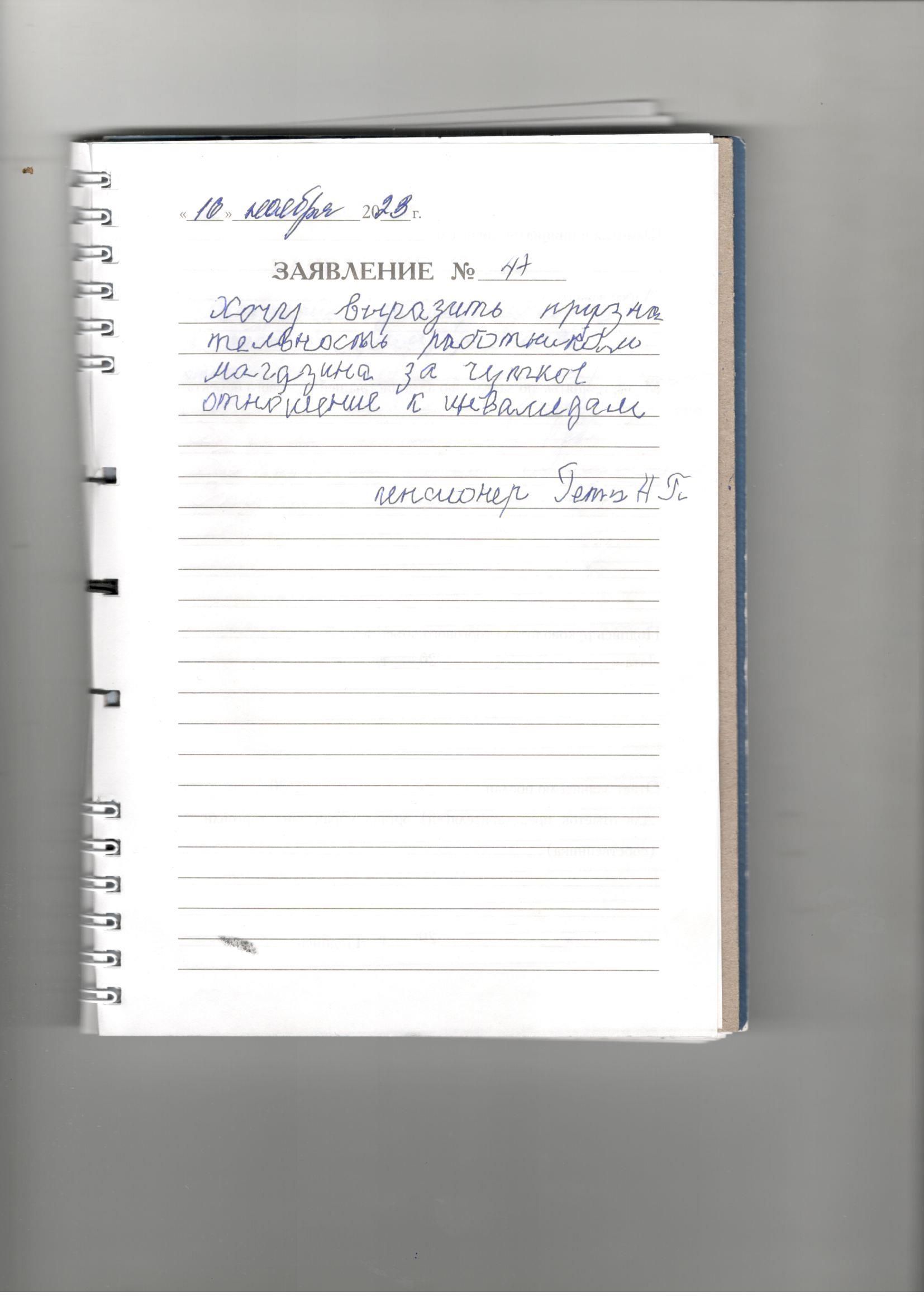 Хочу выразить признательность работникам магазина за чуткое отношение к инвалидам.