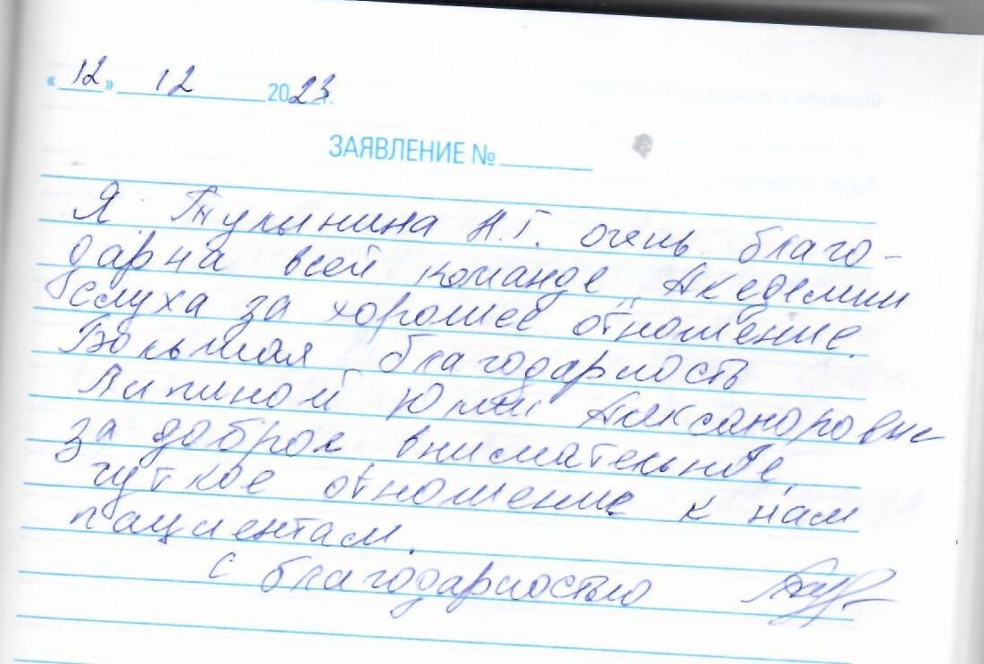 Приношу благодарность и говорю: "Огромное спасибо" Оксане Дмитриевне за чуткое отношение и терпение по подборке слухового аппарата для меня. И подробное объяснение по эксплуатации этого изделия.