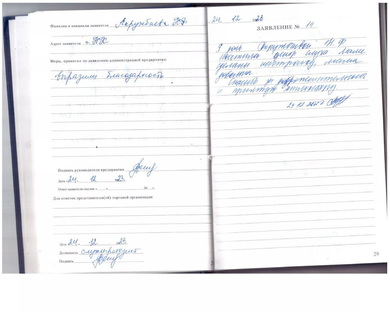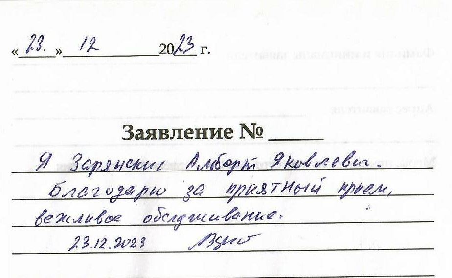 Я,Зарянский Альберт Яковлевич,благодарю за приятный прием,вежливое обслуживание.23.12.2023