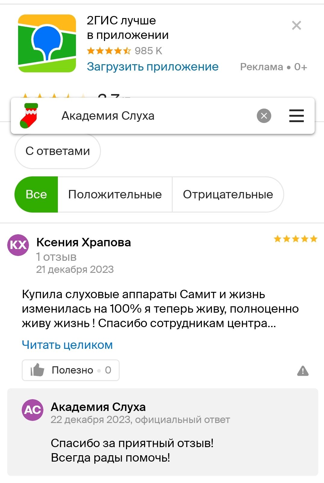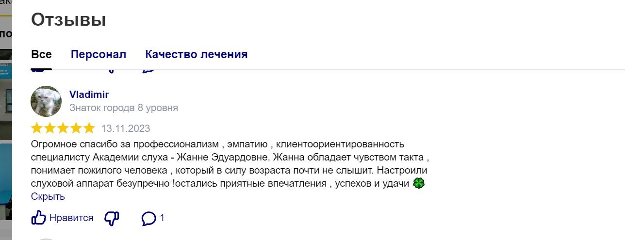 Большое спасибо за профессионализм,эмпатию,клиентоориентированность специалисту Академия слуха Жанне Эдуардовне.Жанна обладает чувством такта.понимания пожилого человека.который в силу возраста почти не слышит.Настроили слуховой аппарат безупречно!остались приятные впечатления,успехов и удачи.