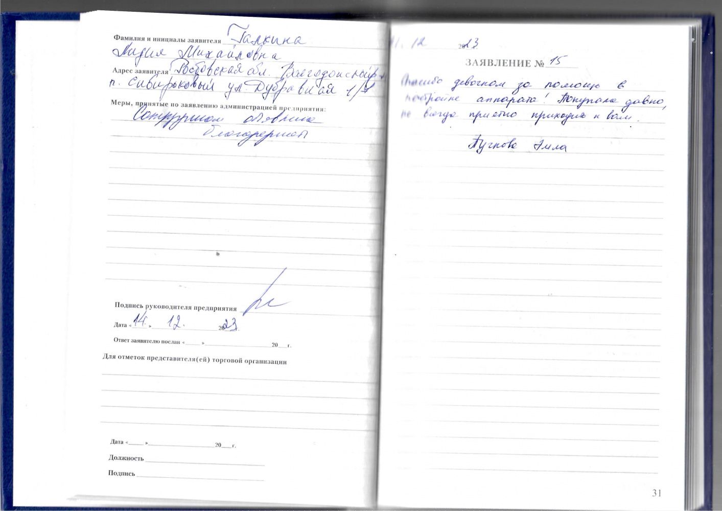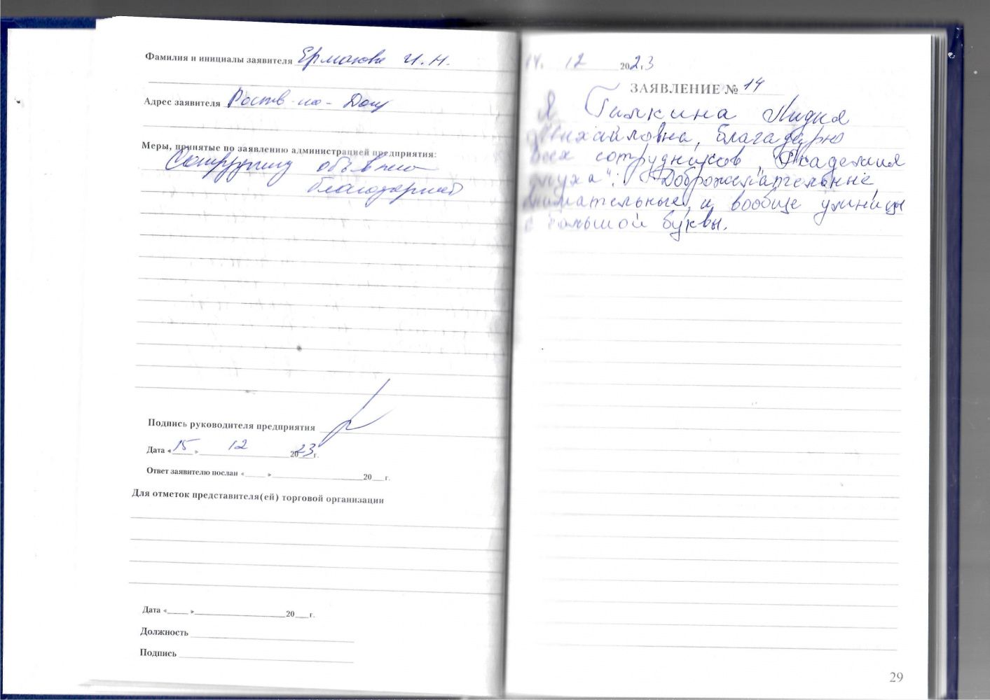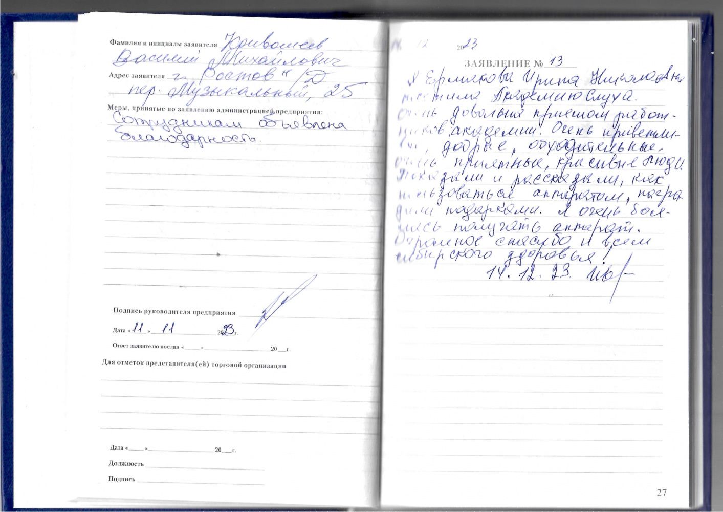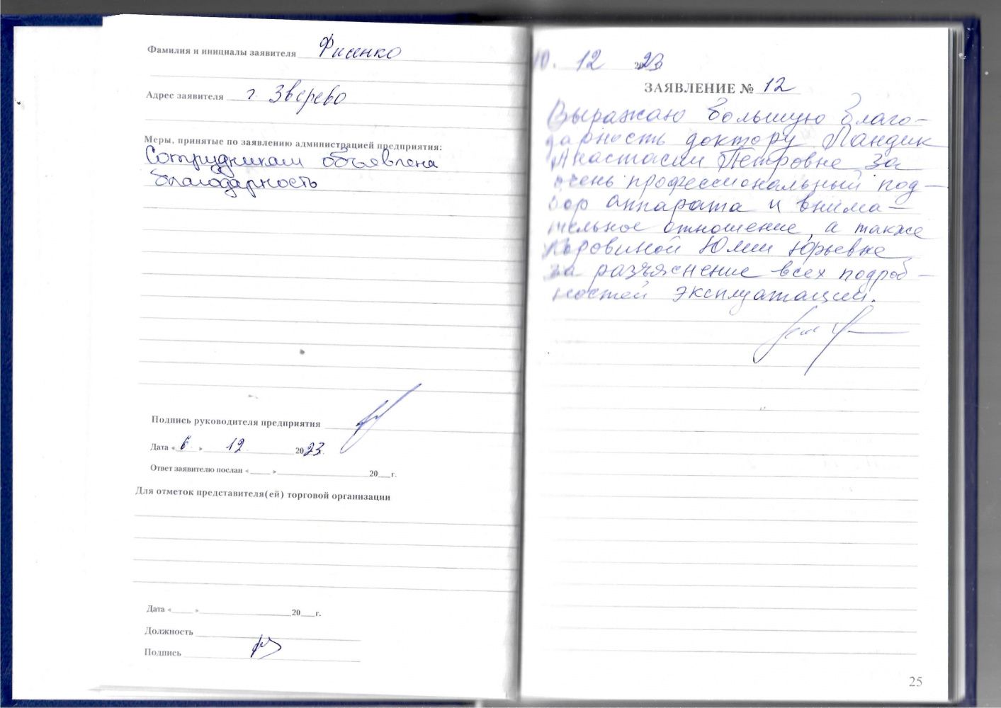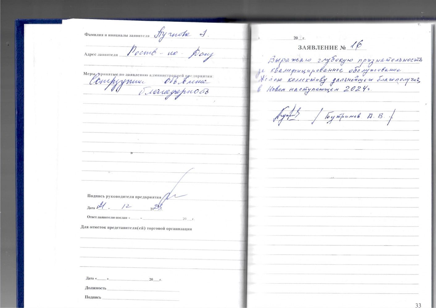 Выражаю глубокую признательность за квалифицированное обслуживание. Желаю коллективу дальнейшего благополучия в Новом наступающем 2024 году.