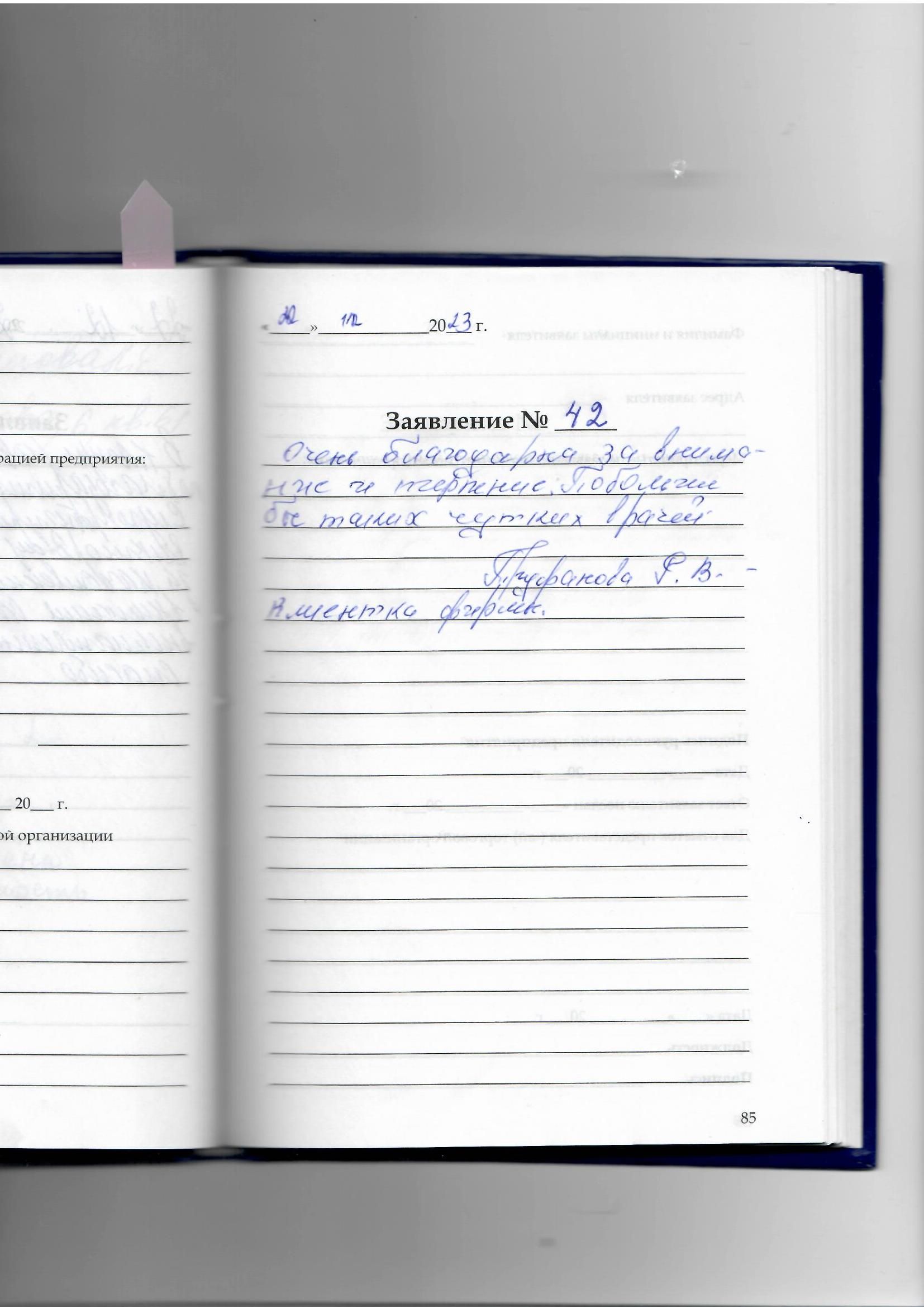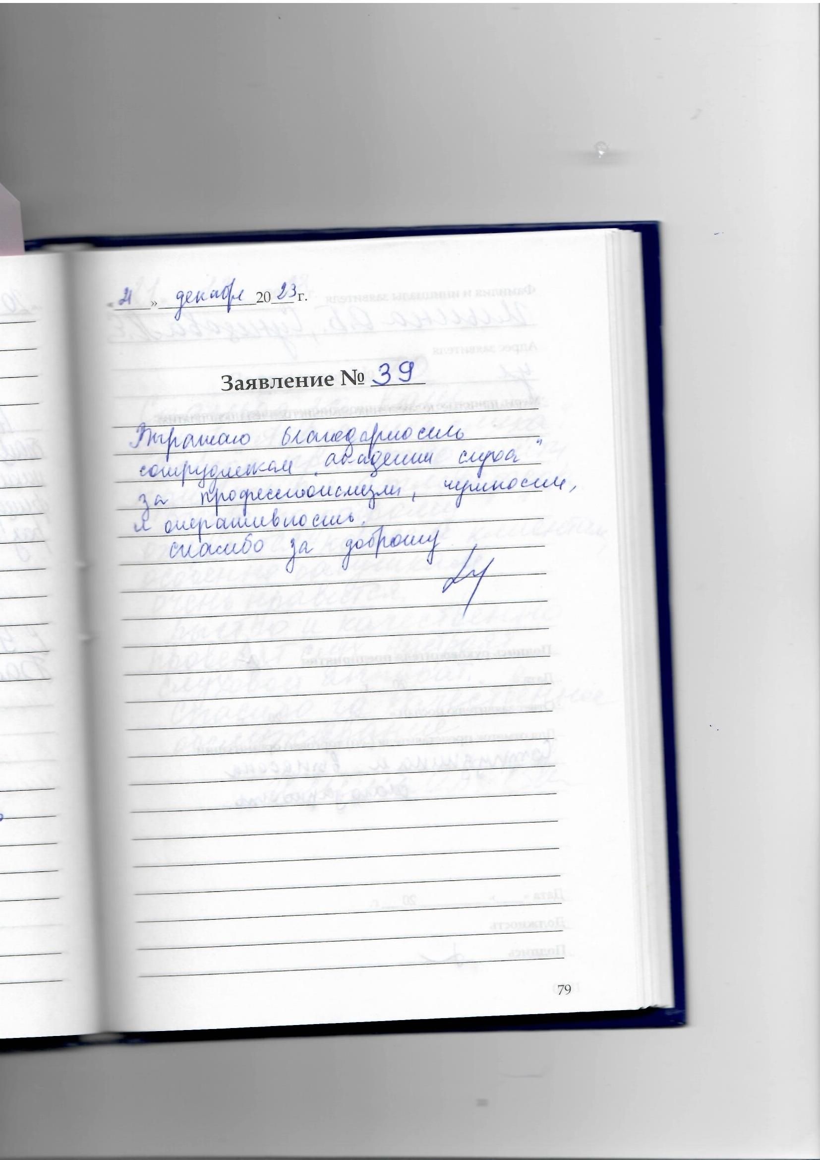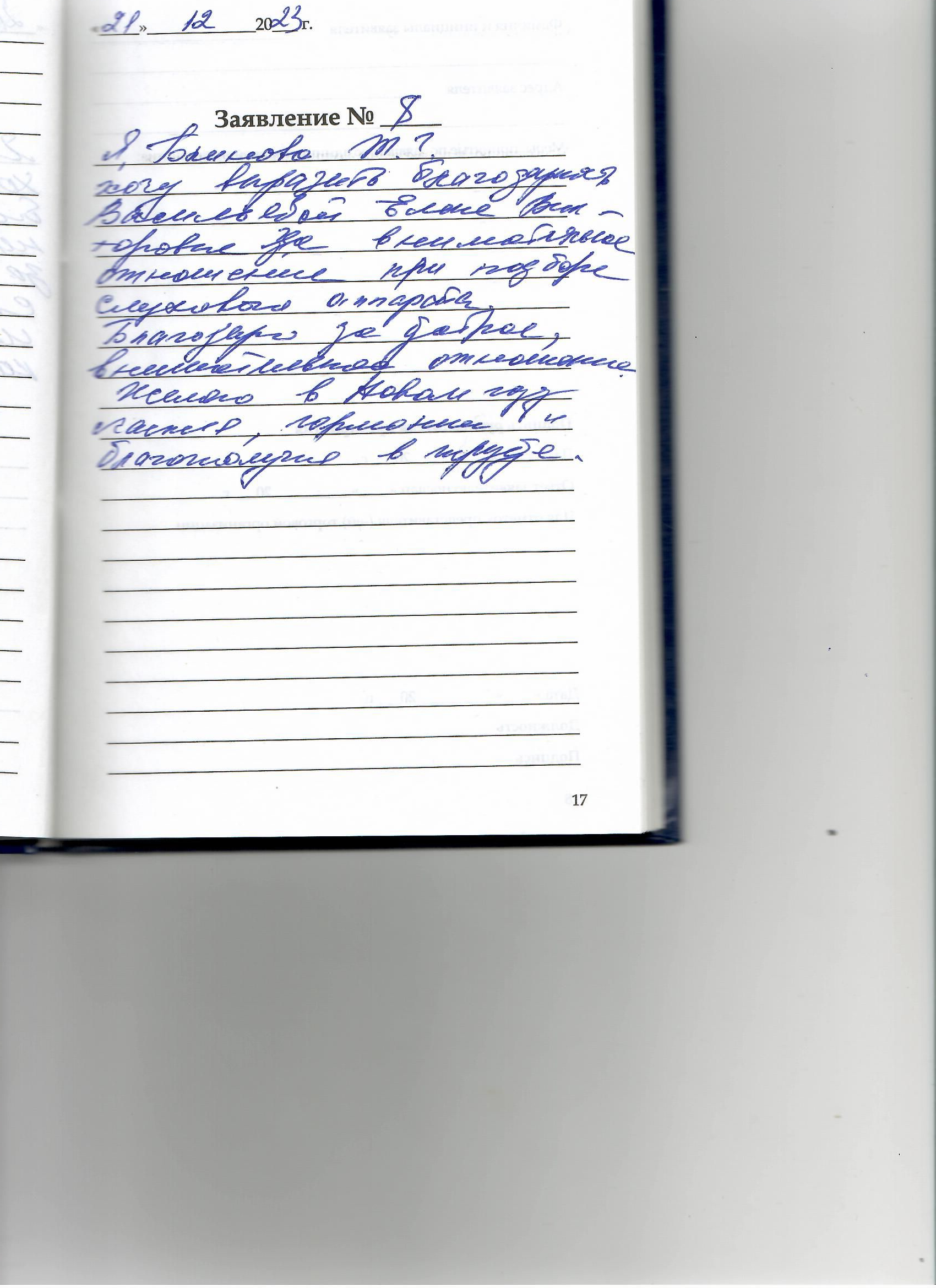 Я, Блинова Татьяна Геннадьевна, хочу выразить благодарность Васильевой Елене Викторовне за внимательное отношение при подборе слухового аппарата. Благодарю за доброе, внимательное отношение. Желаю в Новом Году счастья, гармонии и благополучия в труде!