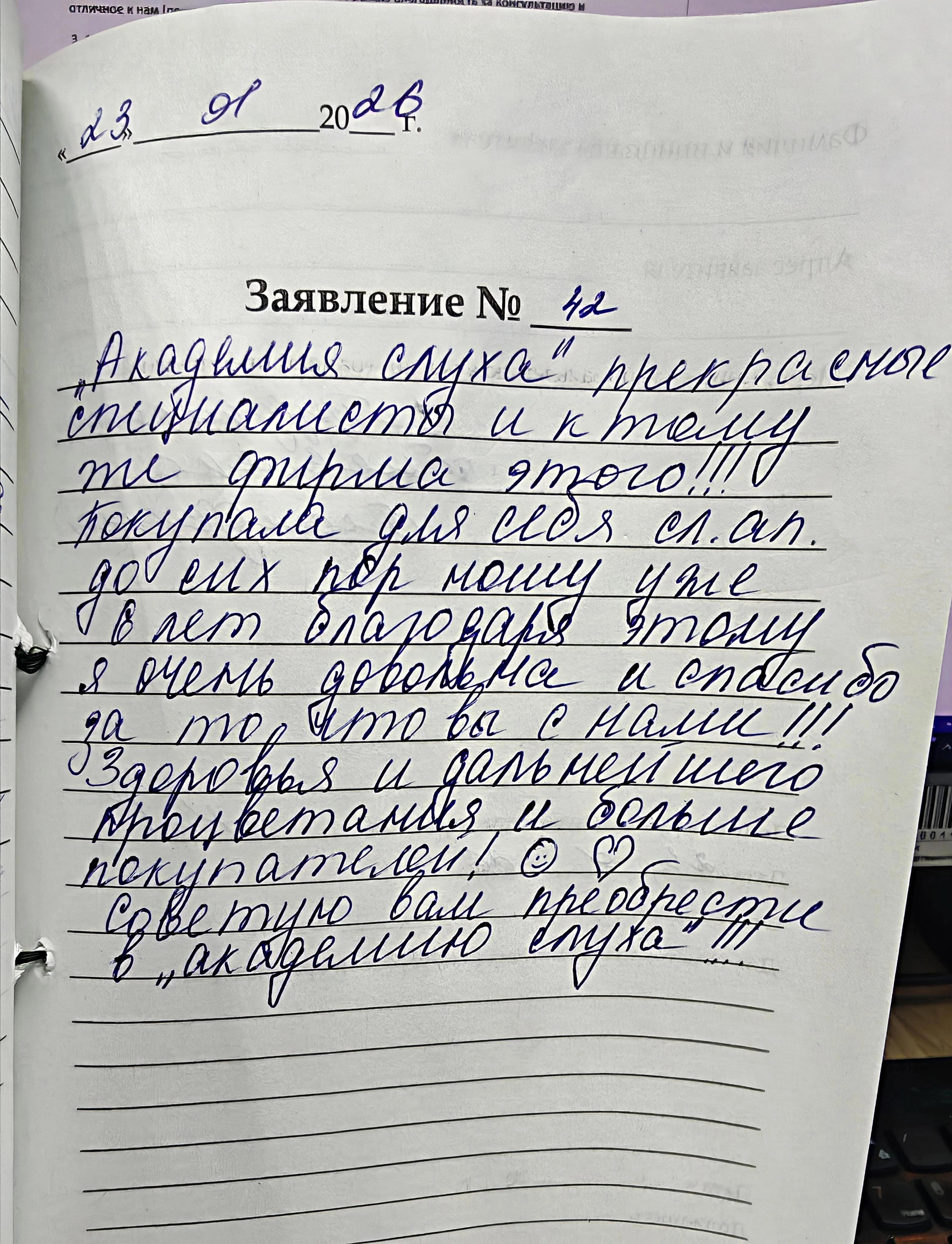 «Академия Слуха» специалисты и к тому же фирма этого!!! Покупала для себе сл.ап. до сих пор ношу уже 6 лет благодаря этому я очень довольна и спасибо за то, что вы с нами!!! Здоровья и дальнейшего процветания и больше покупателей! Советую вам приобрести в «Академию слуха!»!!!