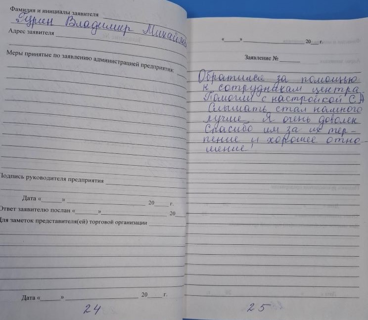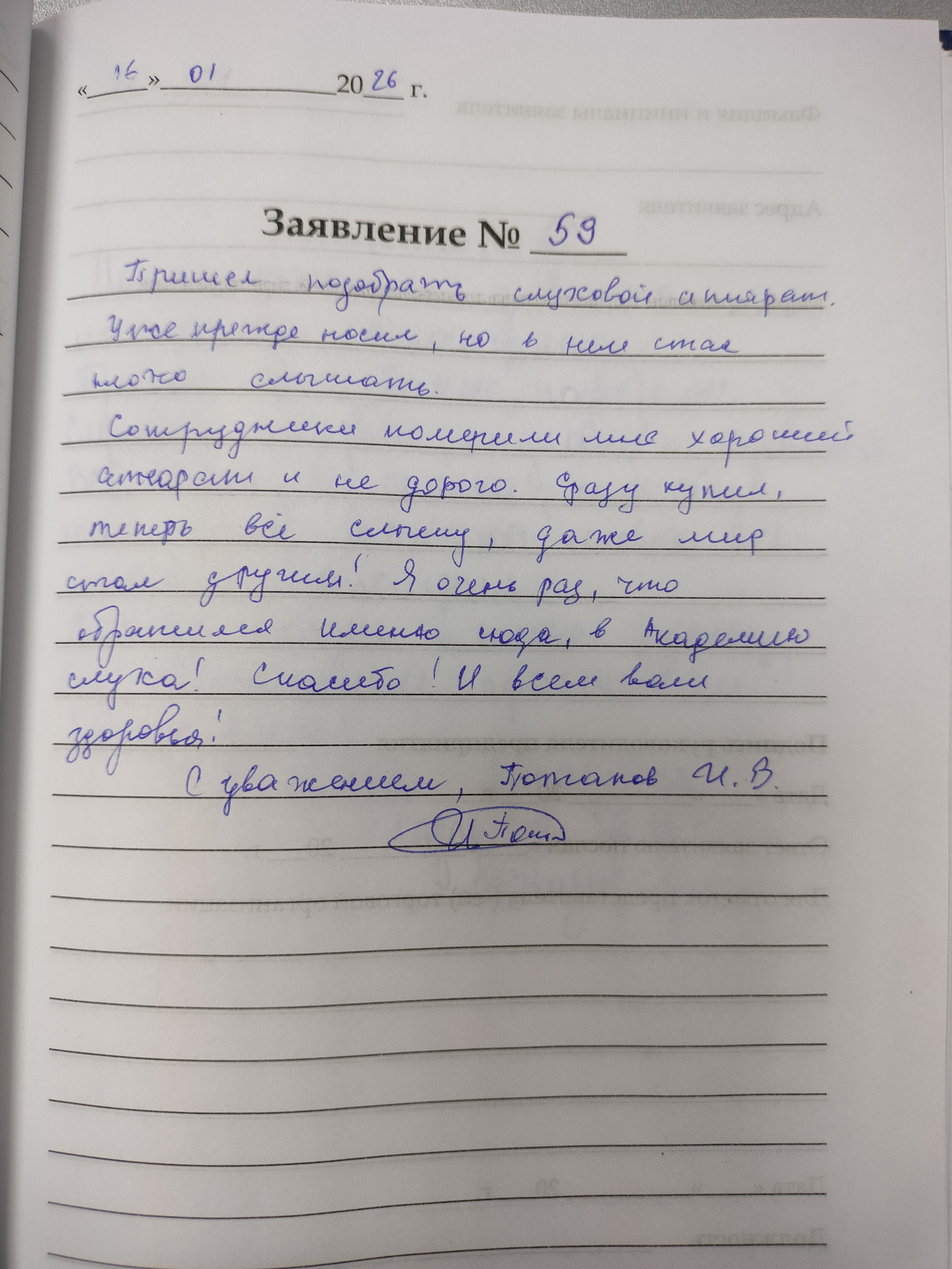 Обратился за помощью к сотрудникам центра. Помогли с настройкой СА. Слышать стал намного лучше. Я очень доволен. Спасибо им за терпение и хорошее отношение.