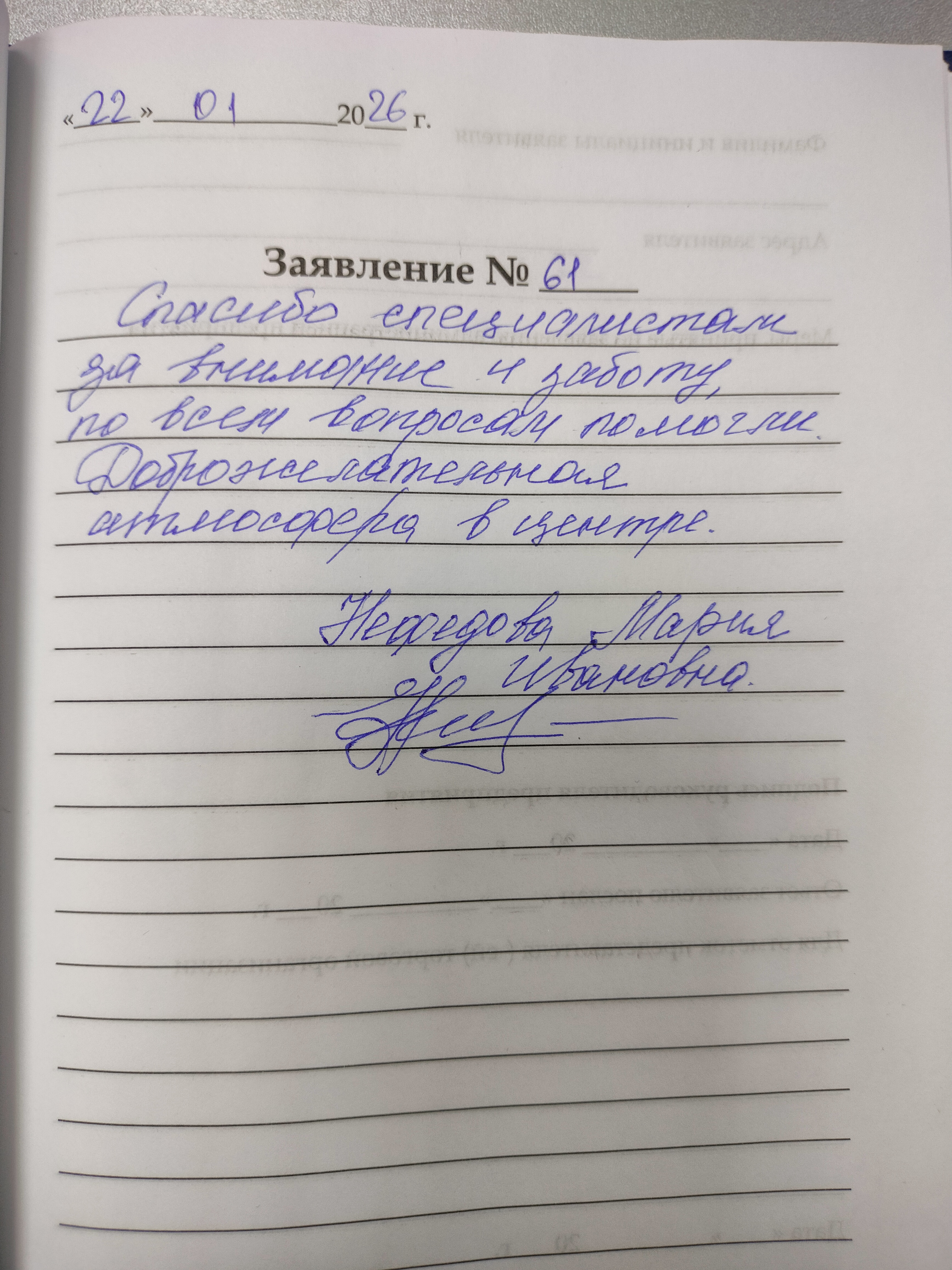 Спасибо специалистам за внимание и заботу, по всем вопросам помогли. Доброжелательная атмосфера в центре.