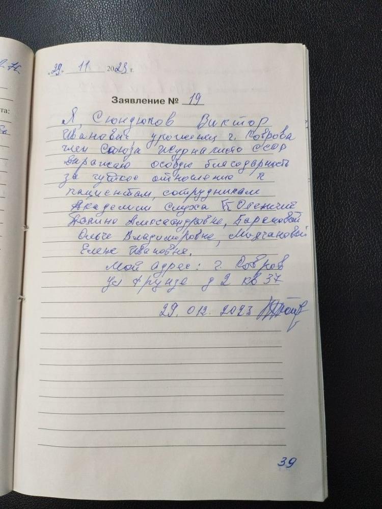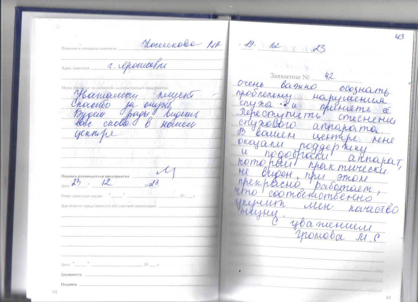 Я, Сюндюков Виктор Иванович, уроженец г. Коврова, член Союза Журналистов СССР выражаю особую благодарность, за чуткое отношение к пациентам, сотрудникам Академии слуха: Оленчик П.А., Барановой О.В., Молчановой Е.И.