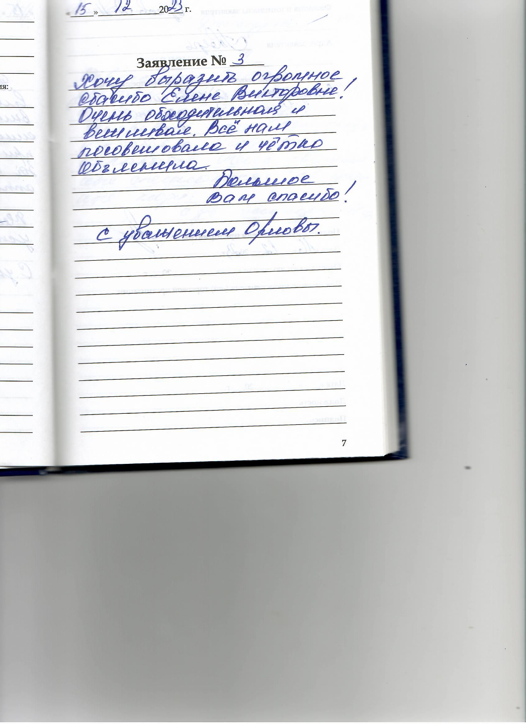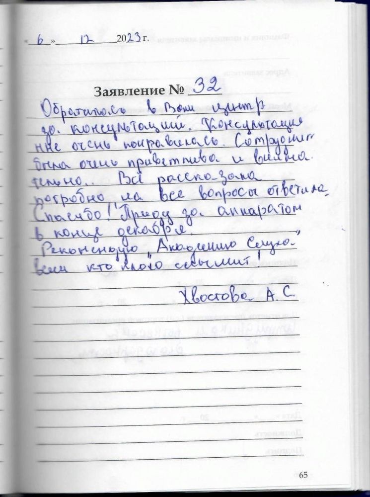 Обратилась в Ваш центр за консультацией. Консультация мне очень понравилась. Сотрудник была очень приветлива и внимательна. Всё рассказала подробно, на все вопросы ответила. Спасибо! Приду за аппаратом в конце декабря.