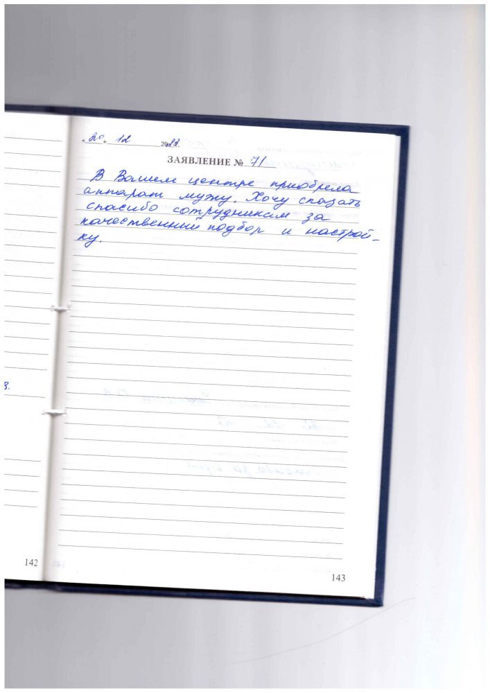 В Вашем центре приобрела аппарат мужу. Хочу сказать спасибо сотрудникам за качественный подбор и настройку.