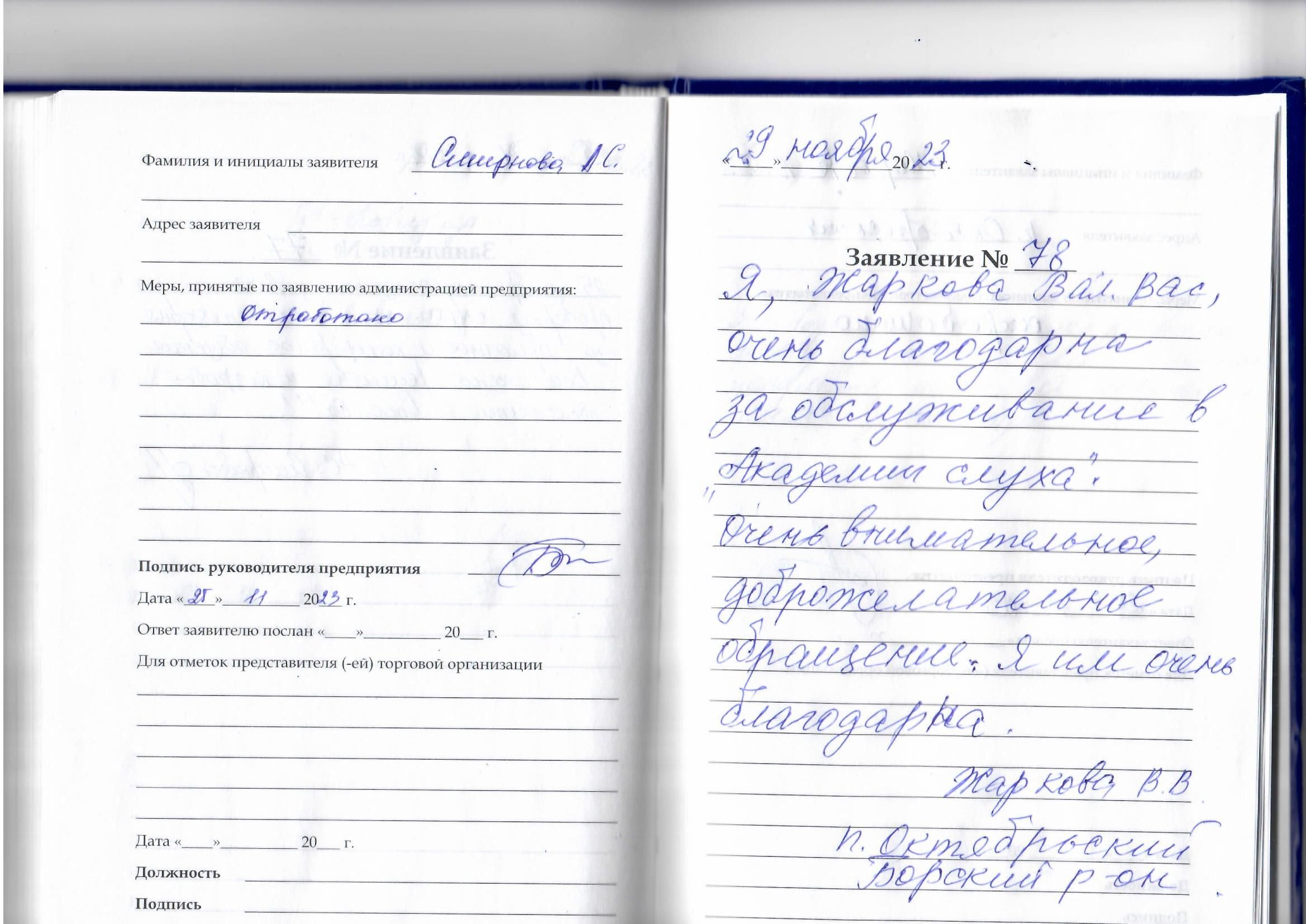 Я, Жаркова Валентина Васильевна очень благодарна за обслуживание в Академии Слуха. Очень внимательное, доброжелательное обращение. Я им очень благодарна!