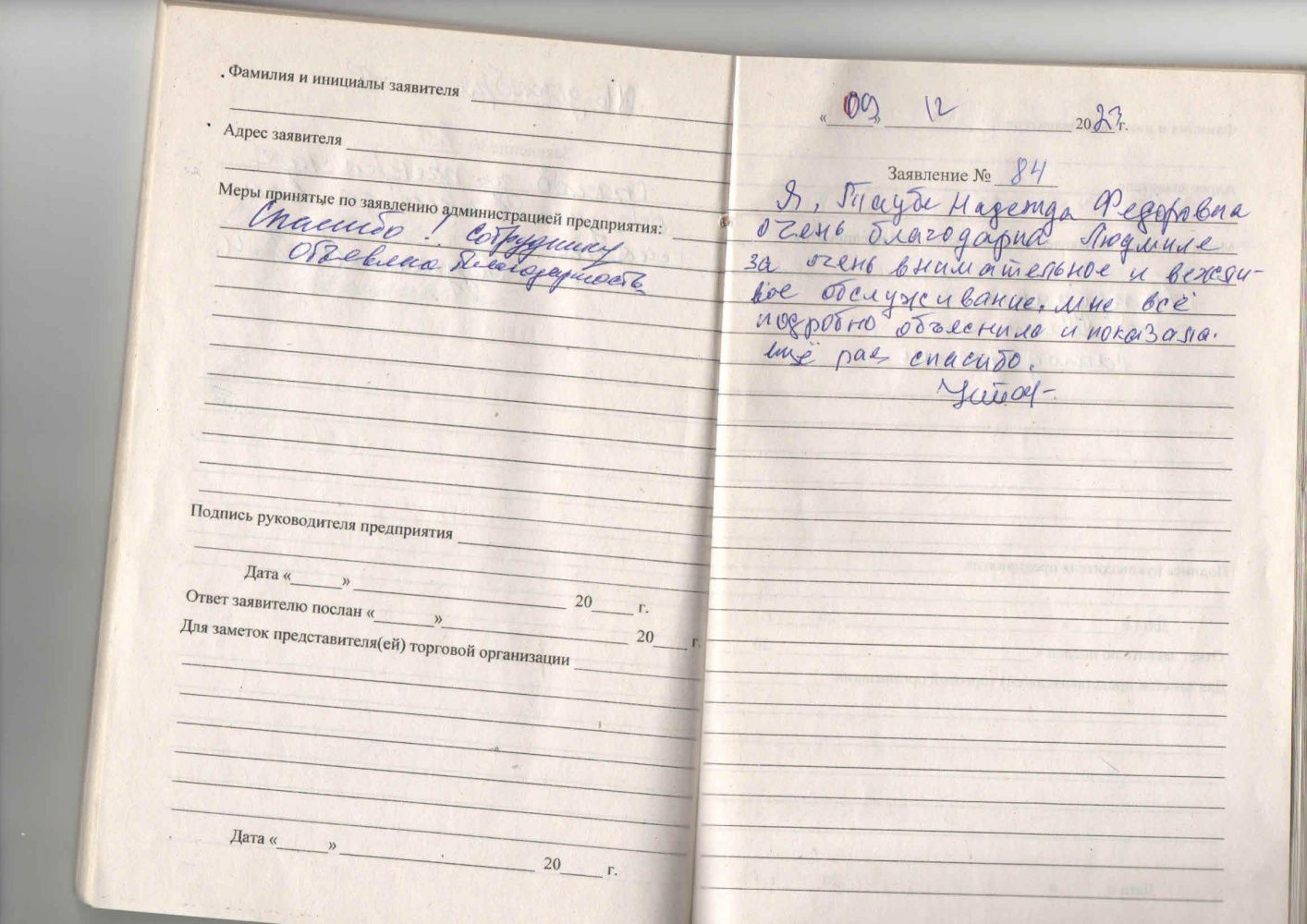 Я, Таубе Надежда Федоровна очень благодарна Людмиле за очень внимательное и вежливое обслуживание. Мне все подробно объяснила и показала. Еще раз спасибо.