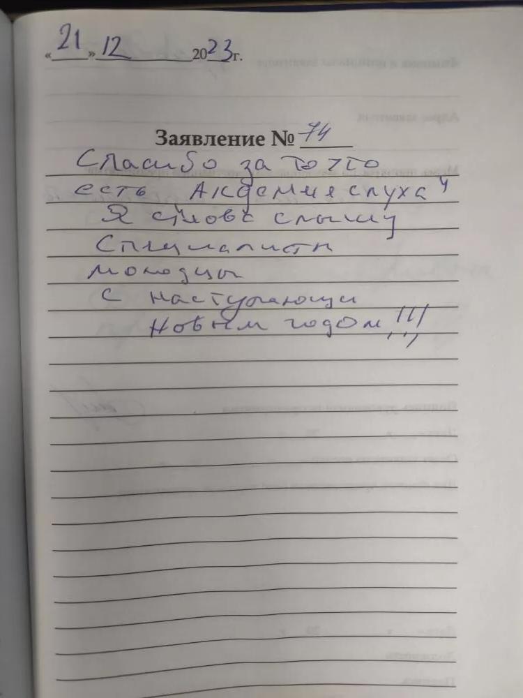 Спасибо за то, что есть "Академия Слуха". Я снова слышу. Специалисты молодцы. С Наступающим Новым годом!!!