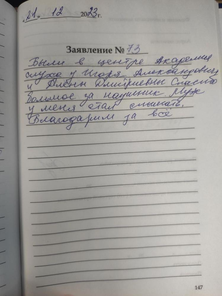 Были в центре "Академия Слуха" у Игоря Александровича и Алены Дмитриевны. Спасибо большое за наушник. Муж у меня стал слышать. Благодарим за все.