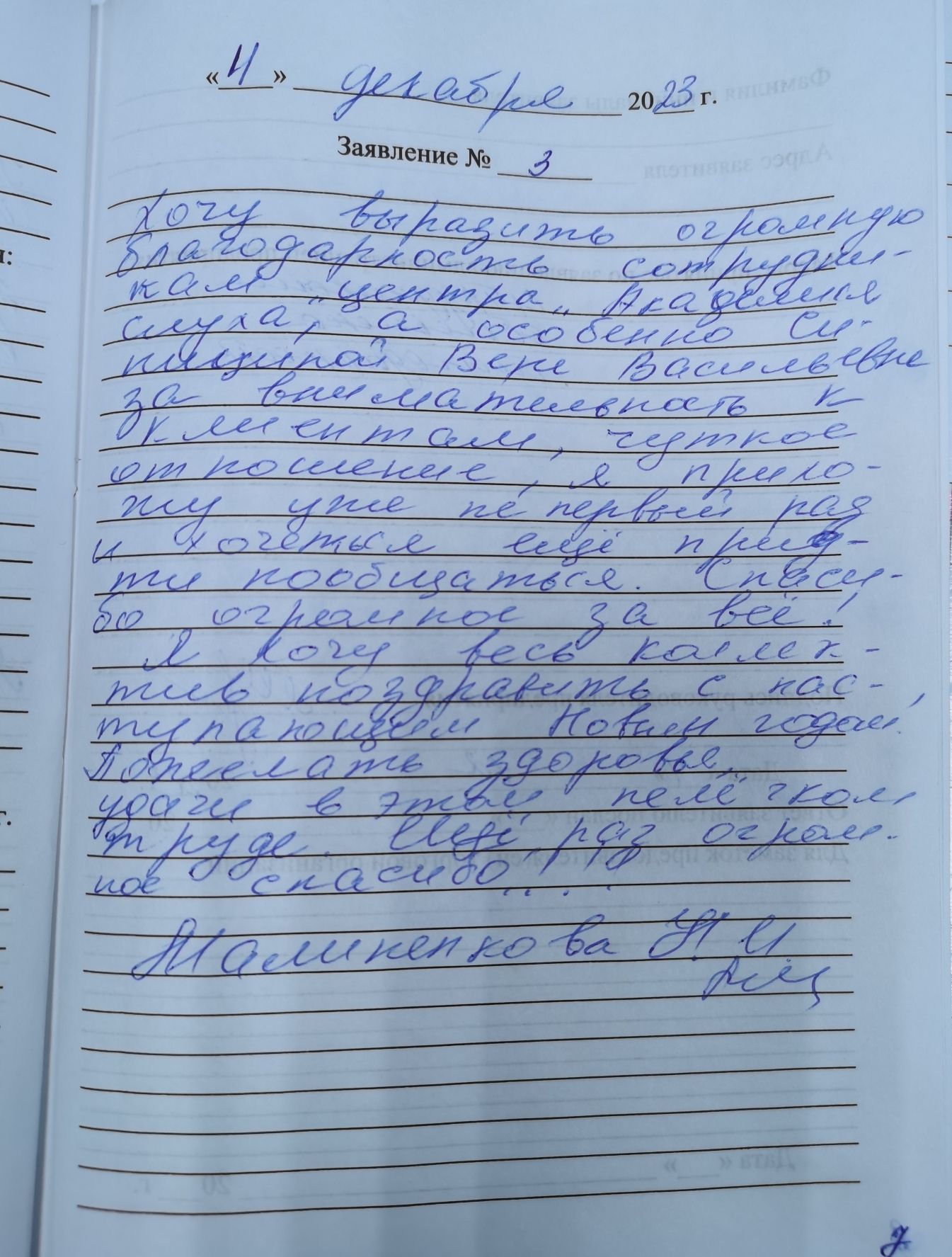 Хочу выразить огромную благодарность сотрудникам центра «академии Слуха», а особенно Синицыной Вере Васильевна за внимательность к клиентам, чуткое отношение. Я прихожу уже не первый раз и хочется еще прийти пообщаться. Спасибо, огромное за всё! Я хочу весь коллектив поздравить с наступающим Новым Годом! Пожелать здоровья, удачи в этом нелегком труде. Еще раз огромное спасибо!!!! Малиненкова Н.И.