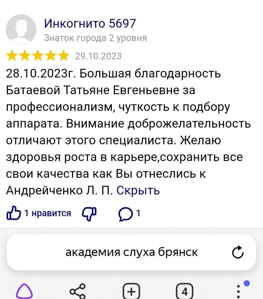 Отзыв с сайта 28.10.2023 Большая благодарность Батаевой Татьяне Евгеньевне за профессионализм, чуткость к подбору аппарата. Внимание доброжелательность отличают этого специалиста. Желаю здоровья, роста в карьере, сохранить все свои качества как Вы отнеслись к Андрейченко Л.П.