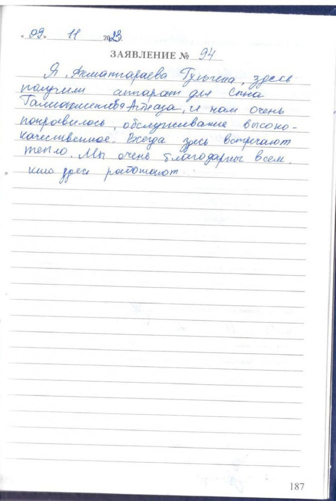 Я, Ахматгараева Гульгена, здесь получили аппарат для сына Галиахметова Айназа, и нам очень понравилось, обслуживание высококачественное. Всегда здесь встречают тепло. Мы очень благодарны всем, кто здесь работают.