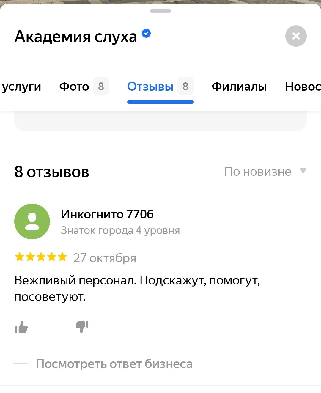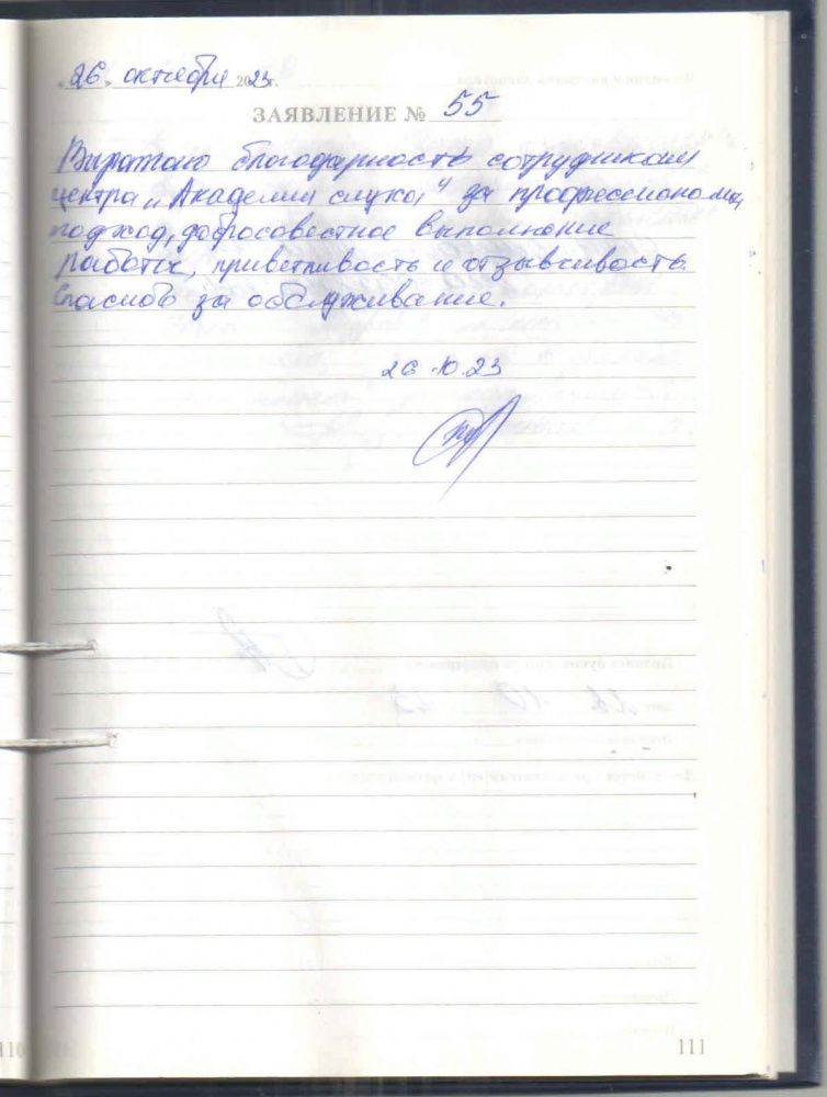 Выражаю благодарность сотрудникам центра «Академия слуха» за профессионализм, подход, добросовестное выполнение работы, приветливость и отзывчивость. Спасибо за обслуживание.