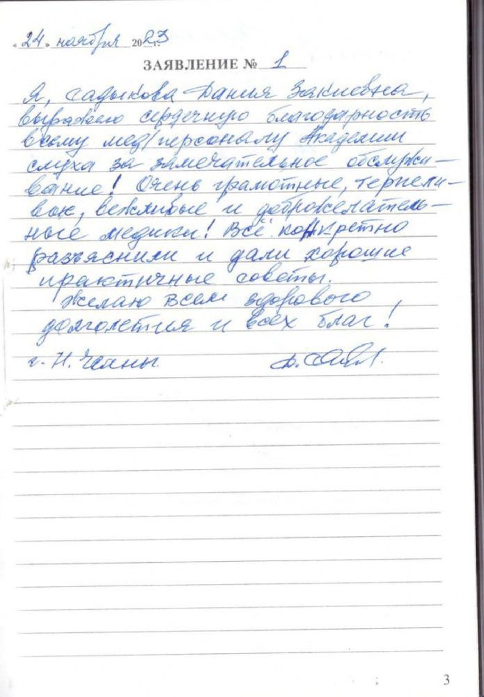 Я, Садыкова Дания Закиевна, выражаю сердечную благодарность всему мед/персоналу Академии слуха за замечательное обслуживание! Очень грамотные, терпеливые, вежливые и доброжелательные медики!