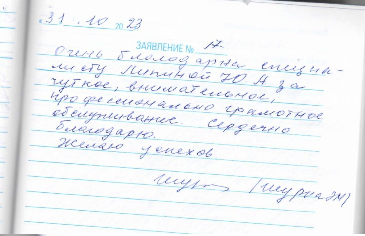 Очень благодарна специалисту Липиной Ю.А. за чуткое внимательное, профессионально грамотное обслуживание. Сердечно благодарю. Желаю успехов.