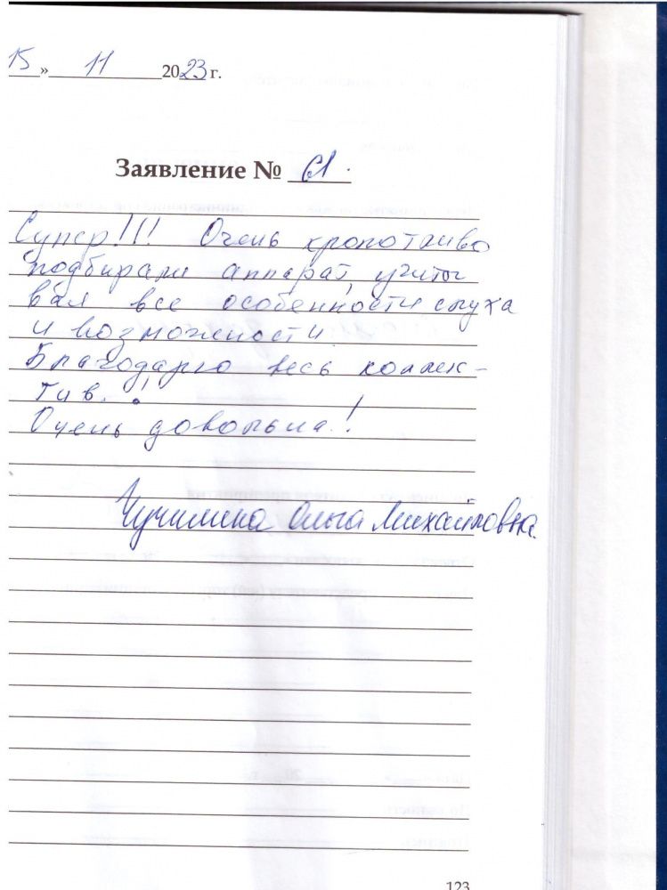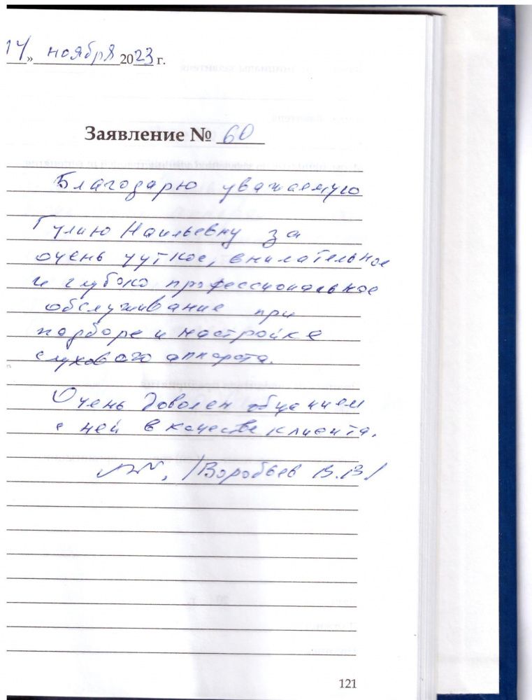 Хочу выразить благодарность за вежливое обращение, профессиональную работу. Маме 82 года и сотрудник Ксения Владимировна смогла подобрать точные вкладыши и настроила точно аппарат. Спасибо ей большое.