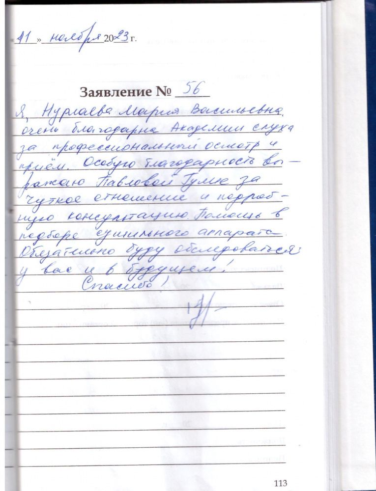 Я ,Нурлаева Мария Васильевна очень благодарна « Академии Слуха» за профессиональный осмотр и прием. Особую благодарность выражаю Павловой Гулие за чуткое отношение и подробную консультацию. Помощь в подборе сушильного аппарата. Обязательно буду обследоваться у вас и в будущем!