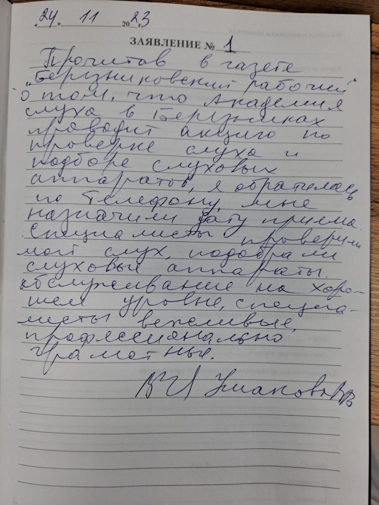 Прочитав в газете " Березниковский рабочий" о том, что Академия слуха в Березниках проводит акцию по проверке слуха и подборе слуховых аппаратов, я обратилась по телефону. Мне назначили дату приема .Специалисты проверили мой слух, подобрали слуховые аппараты . Обслуживание на хорошем уровне, специалисты вежливые, профессионально грамотные. Ушакова В.В.