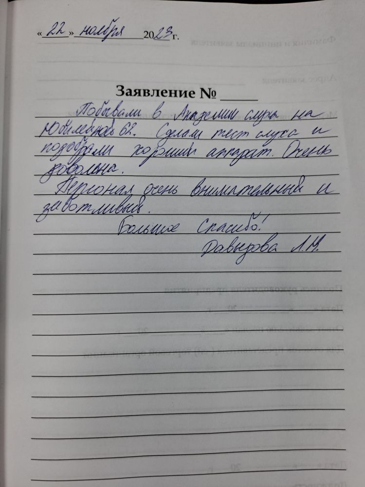 Побывали в Академии слуха на Юбилейной 62. Сделали тест слуха и подобрали хороший аппарат. Очень довольна. Персонал очень внимательный и заботливый. Большое спасибо. Давыдова Л.Н.