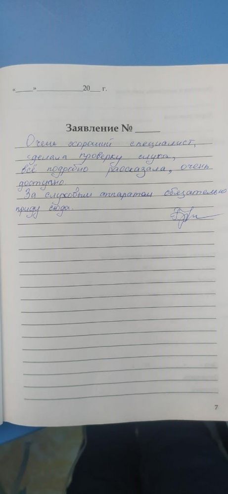 Очень хороший специалист, сделала проверку слуха, всё подробно рассказала, очень доступно. За слуховым аппаратом обязательно приду сюда.