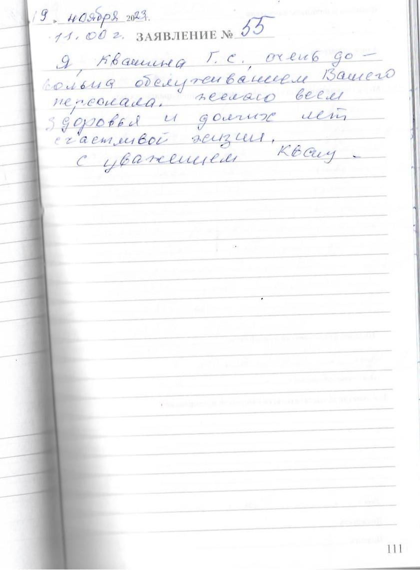 Я, Квашина Галина Семеновна,очень довольна обслуживанием Вашего персонала, желаю всем здоровья и долгих лет счастливой жизни.