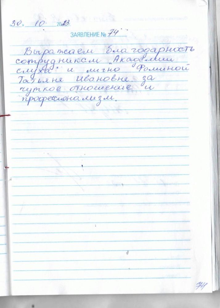 Выражаем благодарность сотрудникам «Академии слуха» и лично Фоминой Татьяне Ивановне за чуткое отношение и профессионализм.