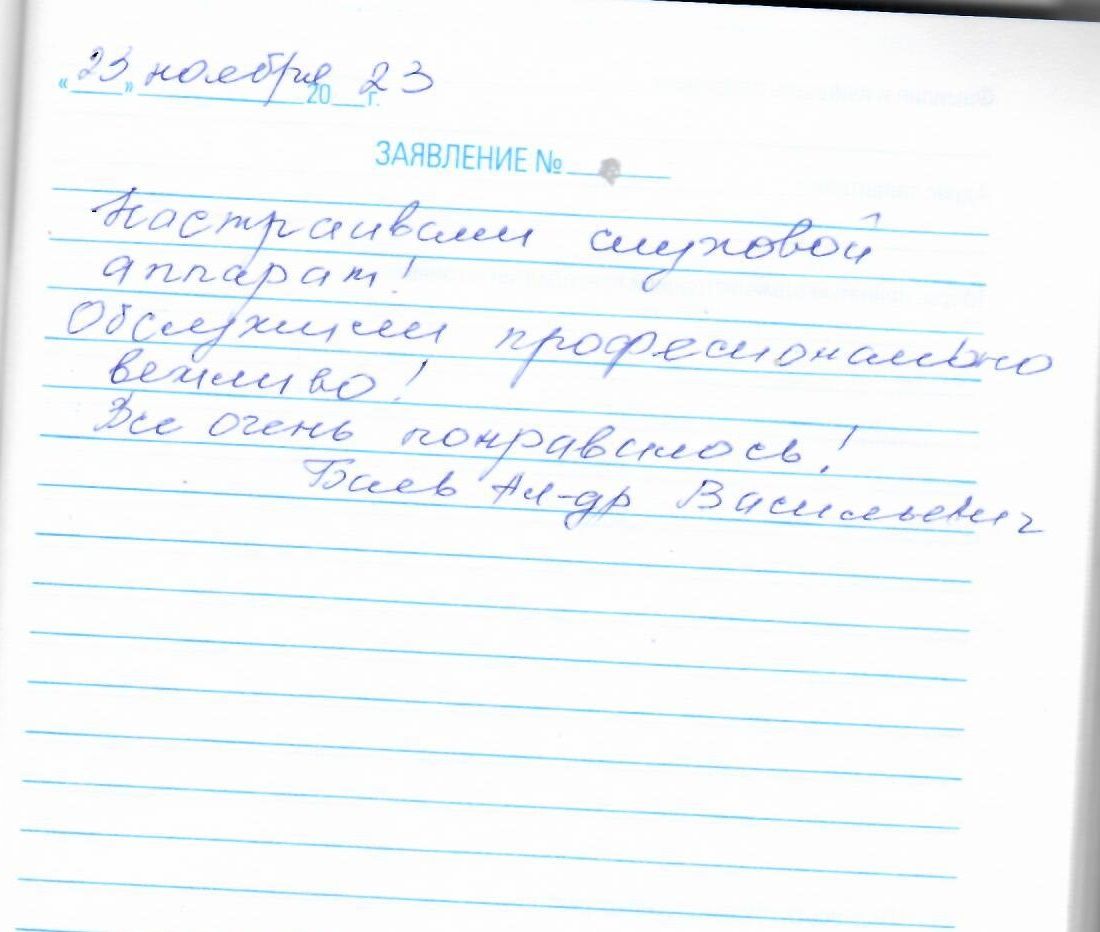 Я, Кириллова Нина Леонидовна, сдала слуховой аппарат на ремонт. Замечательно отремонтировали! Сделали аудиограмму и настроили аппарат. Сейчас с отремонтированным аппаратом, отлично настроенным чувствую себя комфортно, могу спокойно ходить на улице
