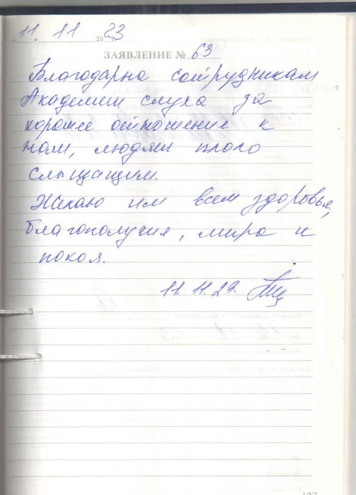 Благодарна сотрудникам Академии слуха за хорошее отношение к нам ,людям плохо слышащим .Желаю им всем здоровья, благополучия, мира и покоя.