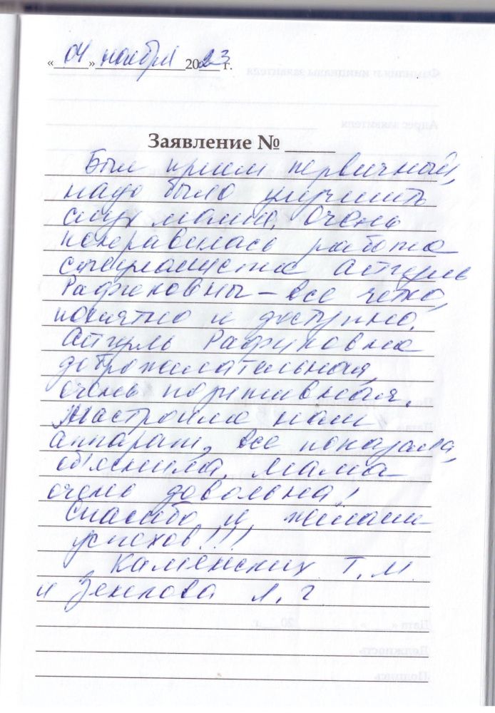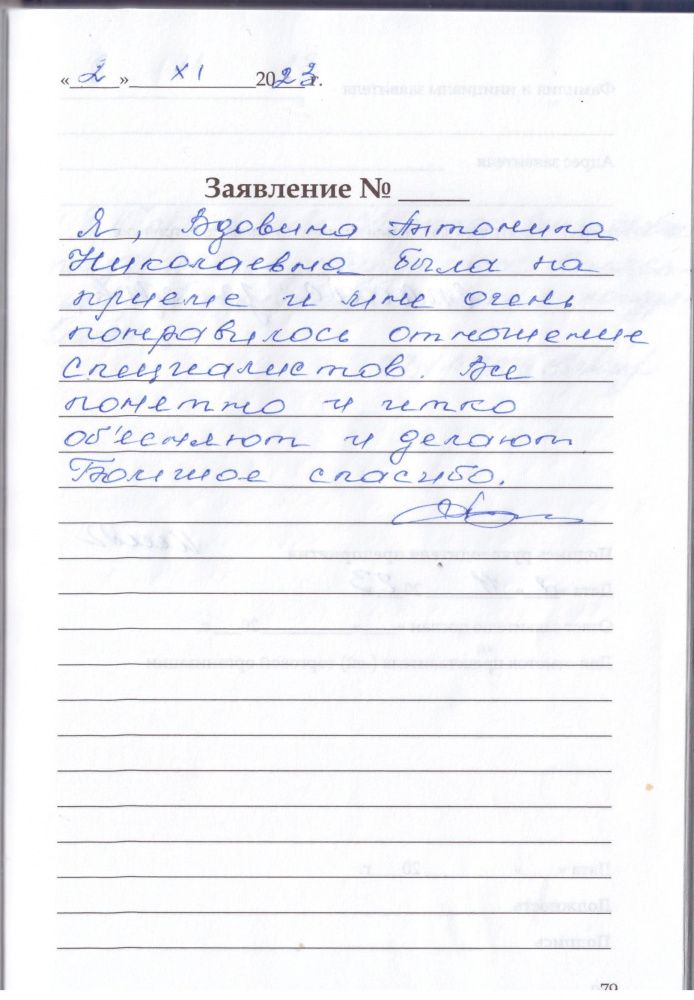 Я, Вдовина Антонина Николаевна, была на приёме и мне очень понравилось отношения специалистов. Всё понятно и четко объясняют и делают . Большое спасибо.