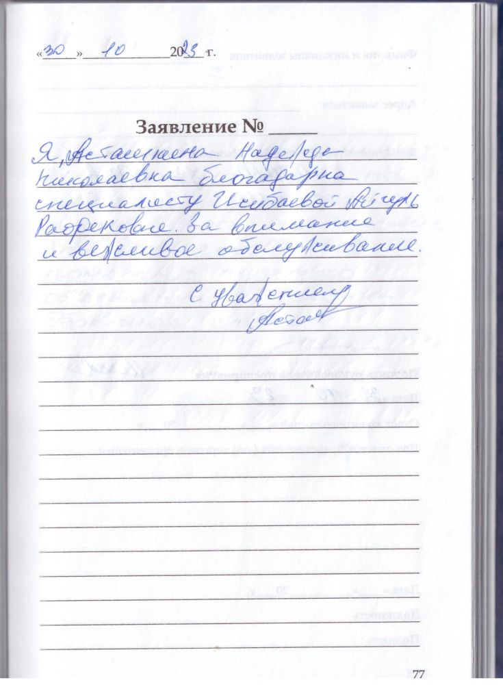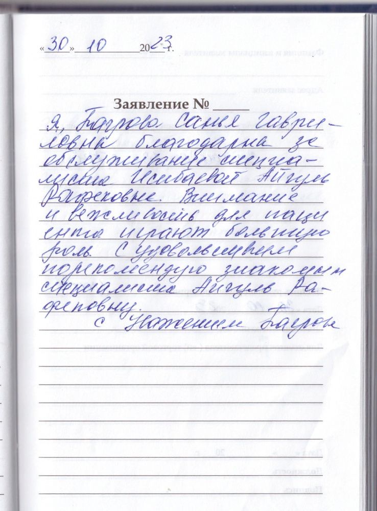 Я,Асташкина Надежда Николаевна, благодарна специалисту Исибаевой Айгуль Рафековне за внимание и вежливое обслуживание. С уважением Асташкина