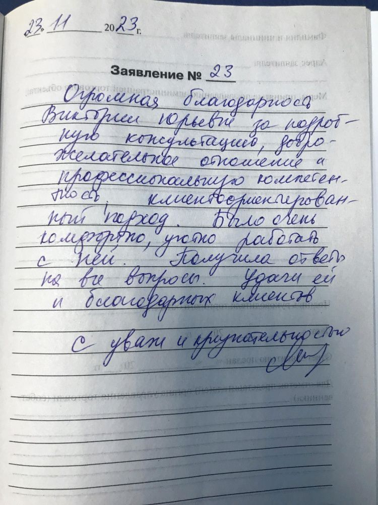 Огромная благодарность Виктории Юрьевне за подробную консультацию, доброжелательное отношение и профессиональную компетентность, клиент ориентированный подход.