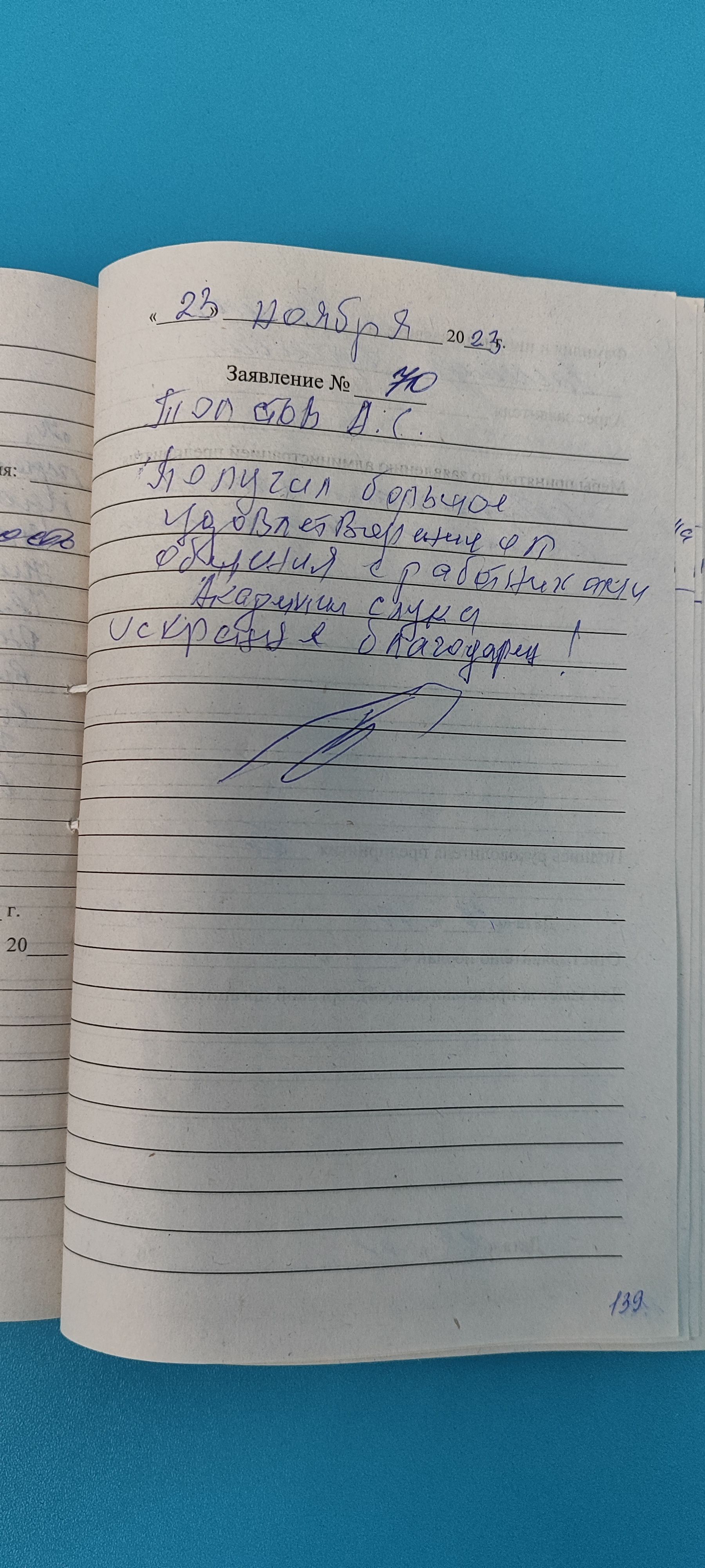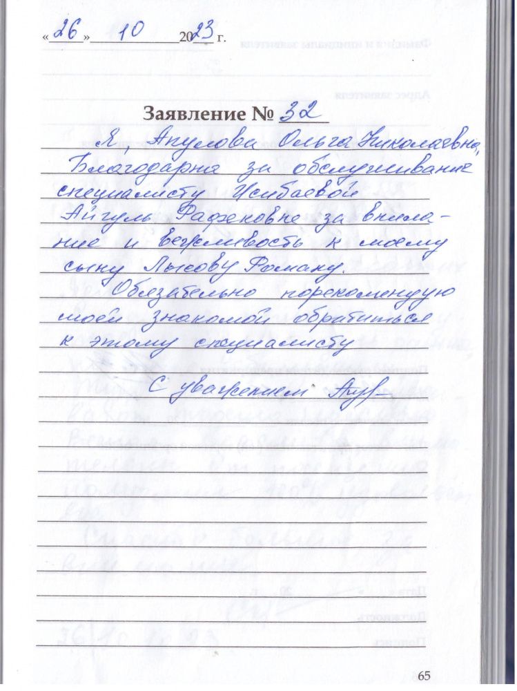 Я, Акулова Ольга Николаевна, благодарна за обслуживание специалисту Исибаевой Айгуль Рафековне за внимание и вежливость к моему сыну Лысову Роману.Обязательно порекомендую моей знакомой обратиться к этому специалисту. С уважением Акулова