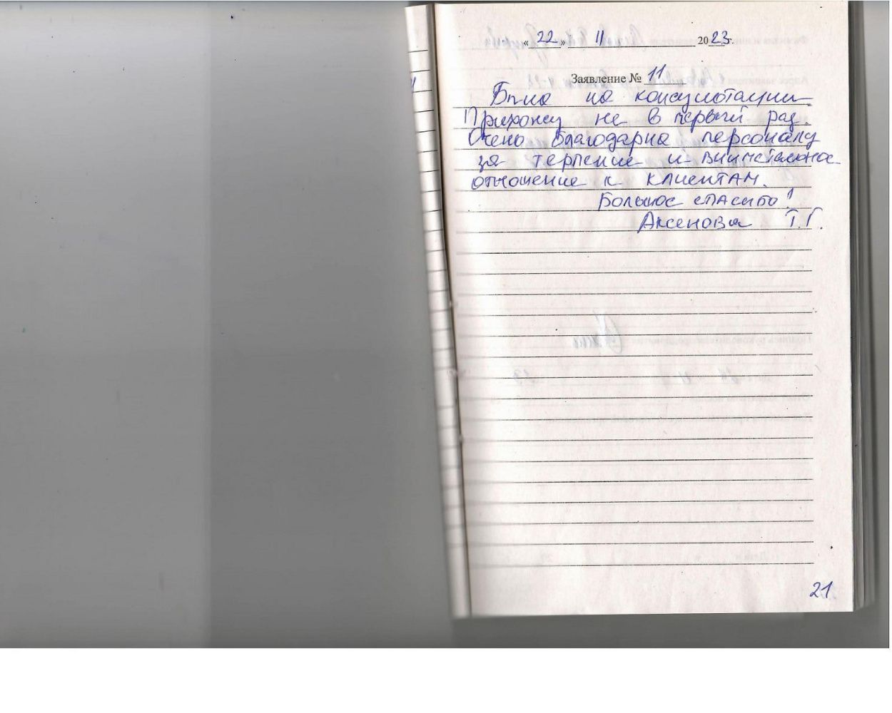 Была на консультации. Прихожу не в первый раз. Очень благодарна персоналу за терпение и внимательное отношение к клиентам. Большое спасибо! Аксенова Т.Г.