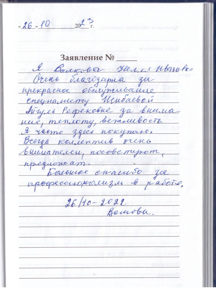 Я, Волкова Нелля Ивановна, очень благодарна за прекрасное обслуживание специалисту Исибаевой Айгуль Рафековне за внимание, теплоту, вежливость. Я часто здесь покупаю. всегда коллектив очень внимателен, посоветуют, предложат. Большое спасибо за профессианализм в работе