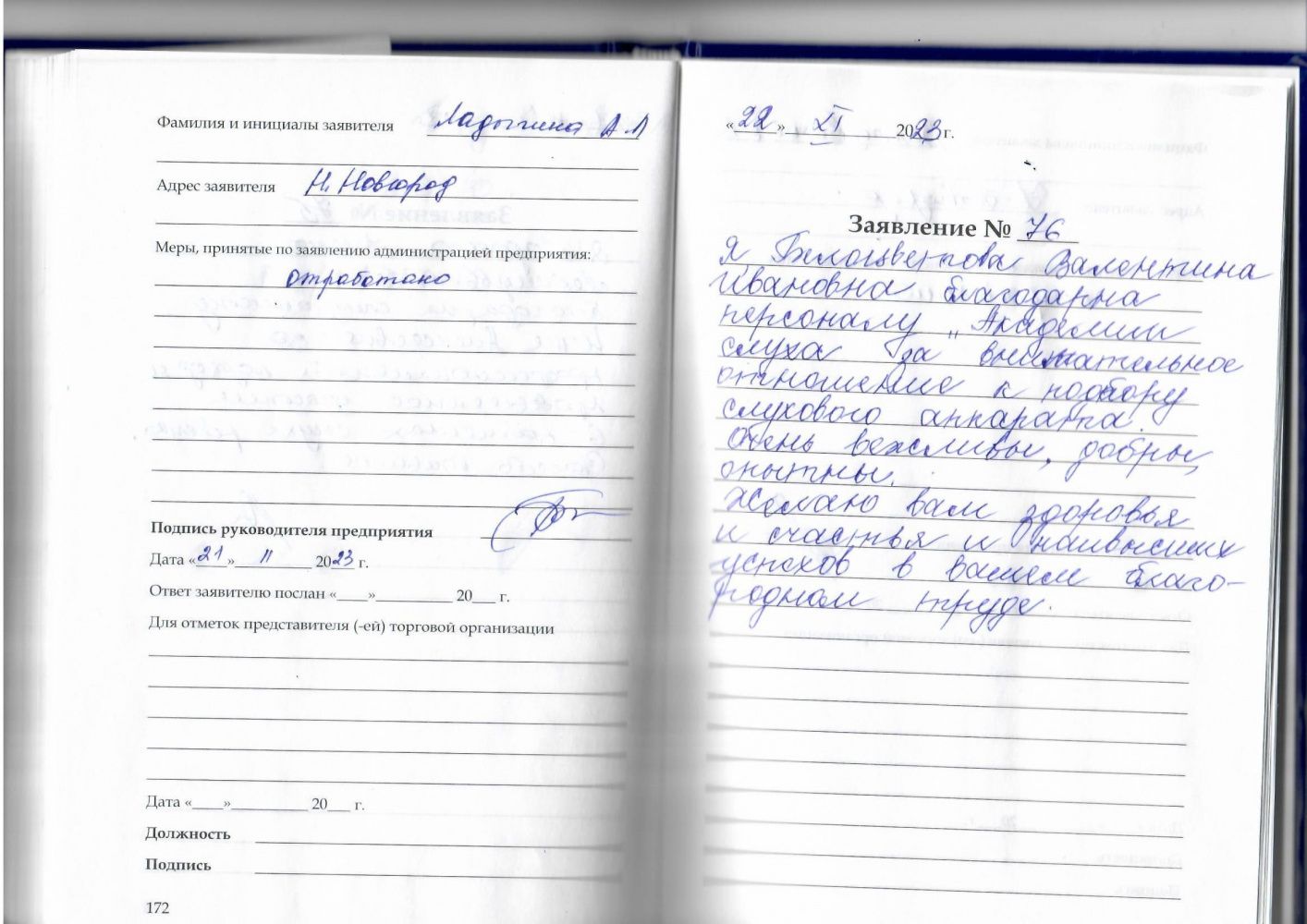 18.11.2023 Я, Нючева Татьяна Александровна, обратилась первый раз. Огромное спасибо за хороший чуткий прием. Всего вам хорошего и с Наступающим Новым годом. Желаю здоровья успехов в работе и в личной жизни. Благодарна!