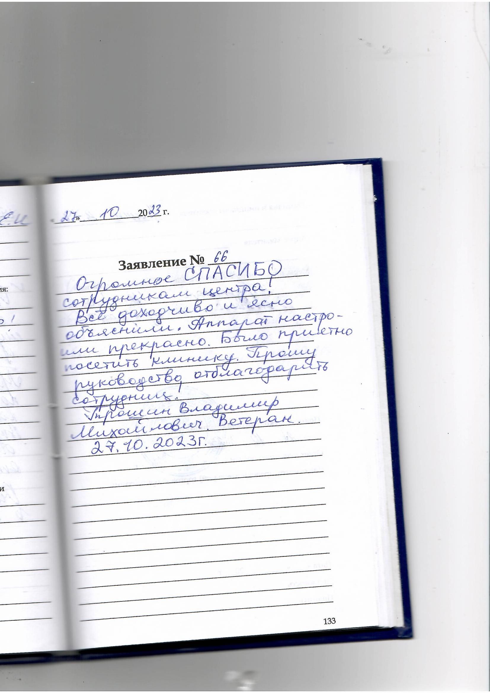 Огромное СПАСИБО сотрудникам Центра! Все доходчиво и ясно объяснили. Аппарат настроили прекрасно. Было приятно посетить клинику. Прошу руководство отблагодарить сотрудниц! Трошин Владимир Михайлович. Ветеран!