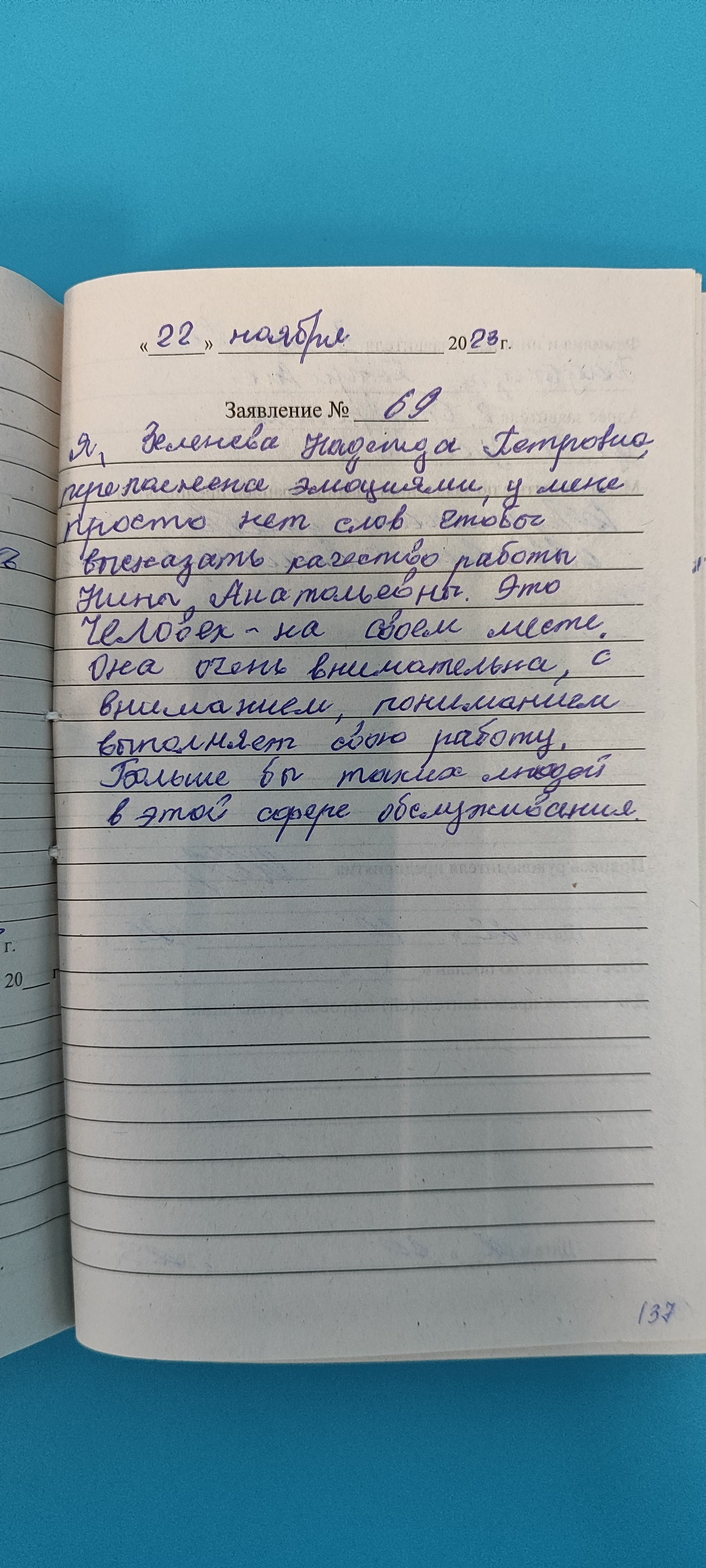 Я, Зеленова Надежда Петровна , переполнена эмоциями , у меня просто нет слов чтобы высказать качество работы Нины Анатольевны . Это человек - на своем месте . Она очень внимательна , с вниманием , пониманием выполняет свою работу.