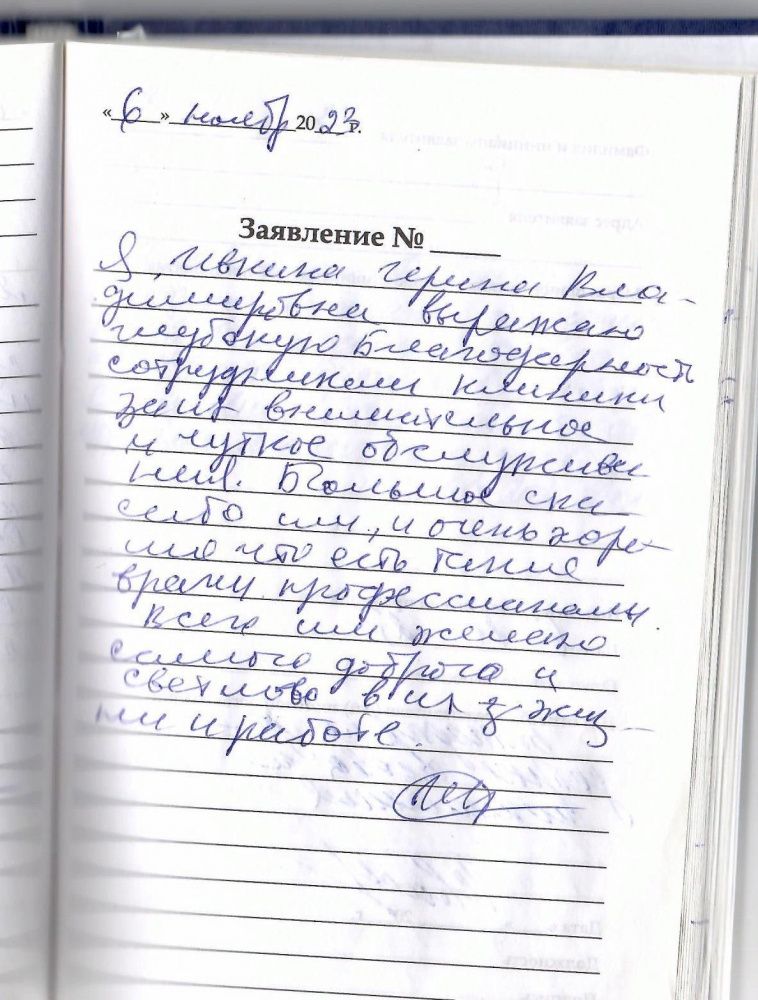 Я, Ивкина Ирина Владимировна, выражаю глубокую благодарность сотрудникам клиники за их внимательное и чуткое обслуживание. Большое спасибо им, и очень хорошо, что есть такие врачи профессионалы Всего им желаю самого доброго и светлого в их жизни и работе.