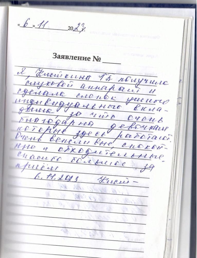 Я, Кисткина Галина Петровна, получила слуховой аппарат и сделала слепок ушного индивидуального вкладыша, за что очень благодарна девочкам, которые здесь работают. Очень вежливые, спокойные и обходительные. Спасибо большое за прием.