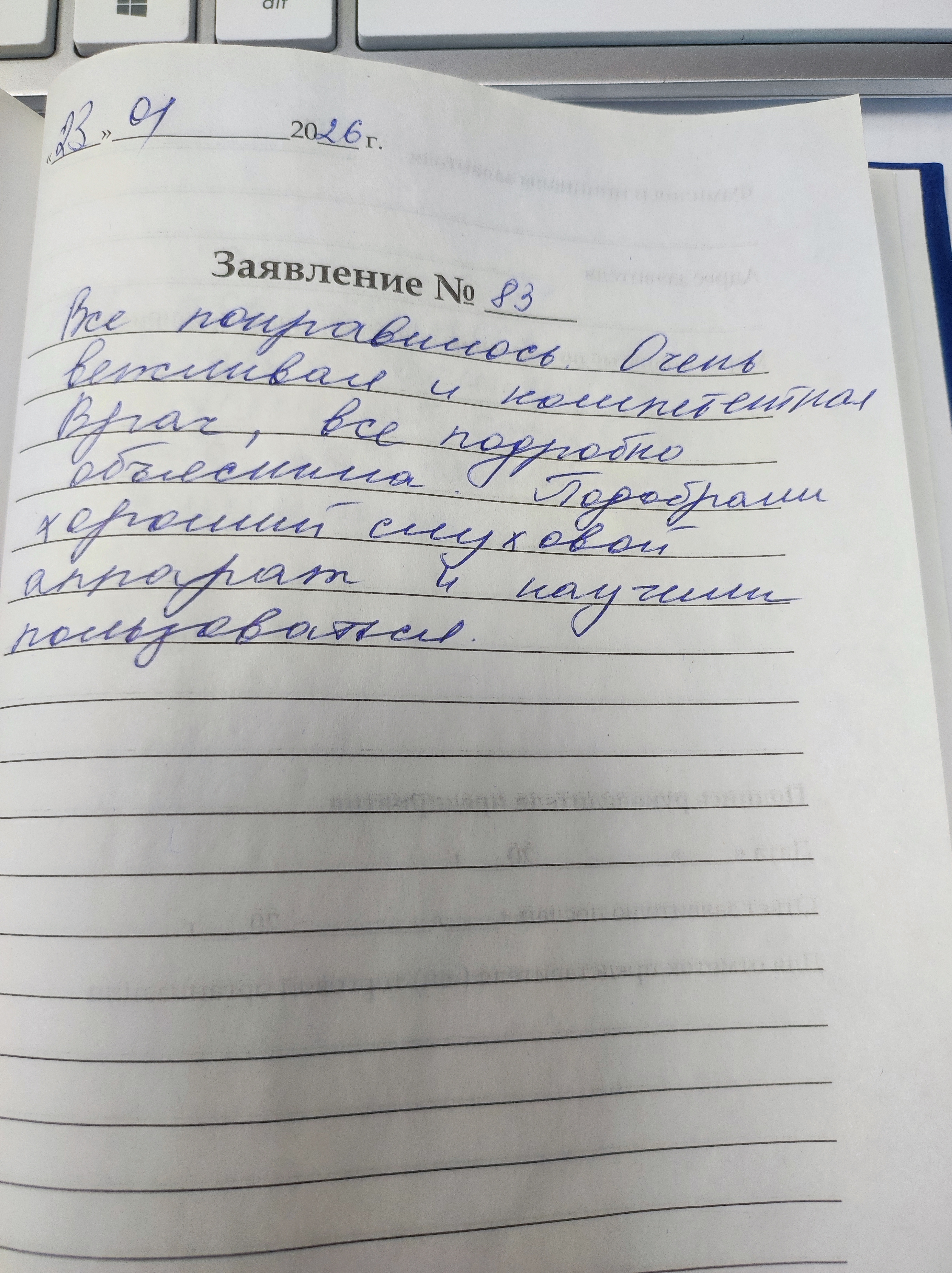 Все понравилось.Очень вежливая и компетентная врач,все подробно объяснила,Подобрали хороший слуховой аппарат и научили пользоваться.