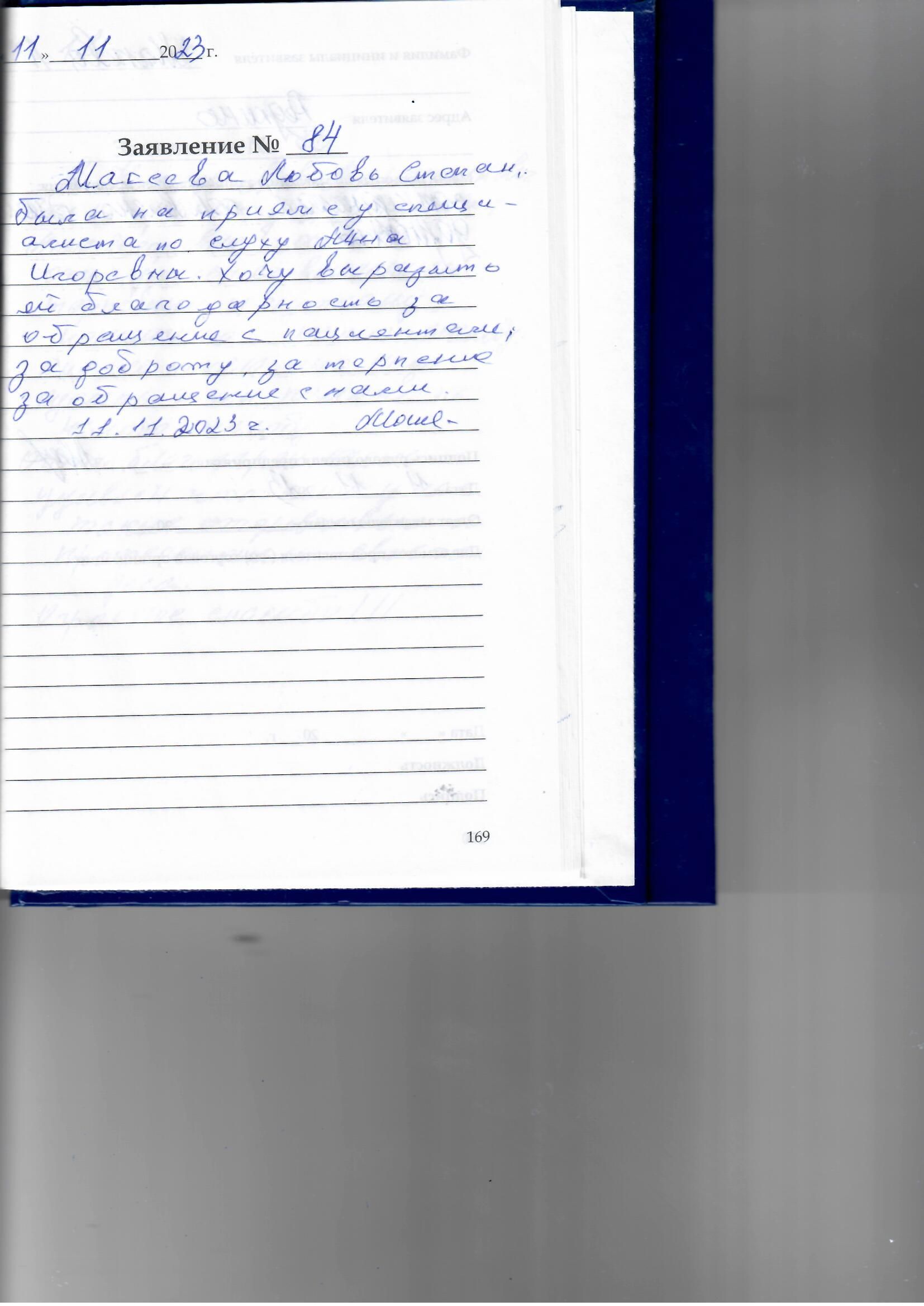 Макеева Любовь Степановна была на приёме у специалиста по слуху Анны Игоревны. Хочу выразить ей благодарность за обращение с пациентами, за доброту, за терпение, за обращение с нами.