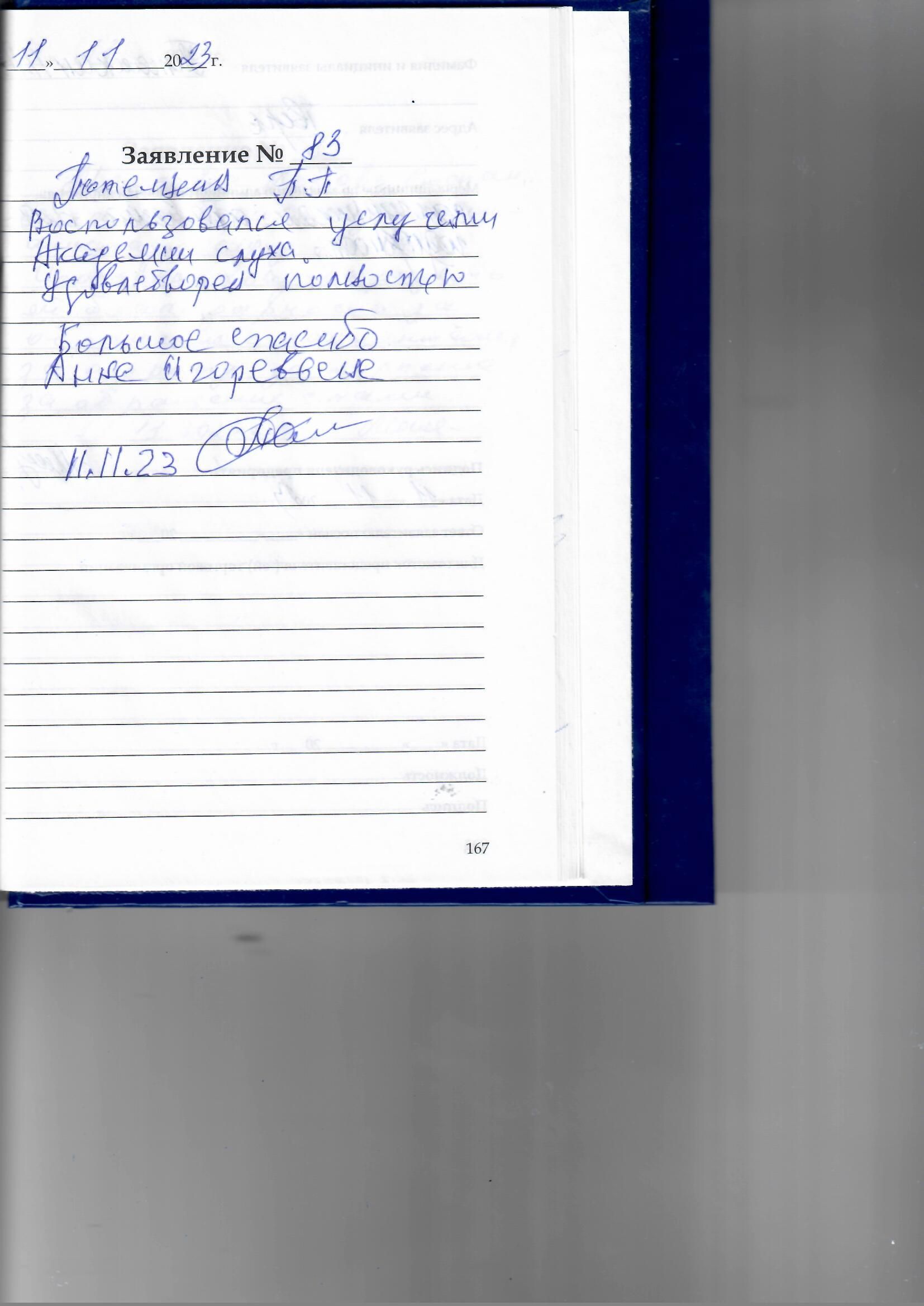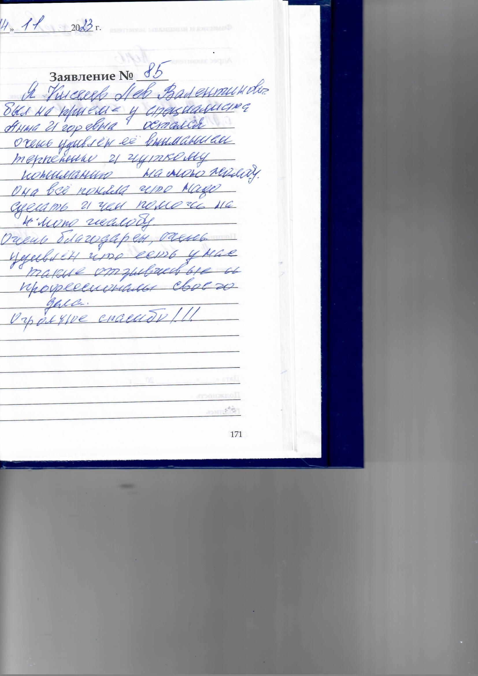 Я, Киселев Лев Валентинович был на приёме у специалиста Анна Игоревна остался очень удивлен её вниманием, терпением и чуткому пониманию на мою жалобу. Она всё поняла, что надо сделать и чем помочь на мою жалобу. Очень благодарен, очень удивлен, что есть у нас такие отзывчивые и профессионалы своего дела. Огромное спасибо!!!