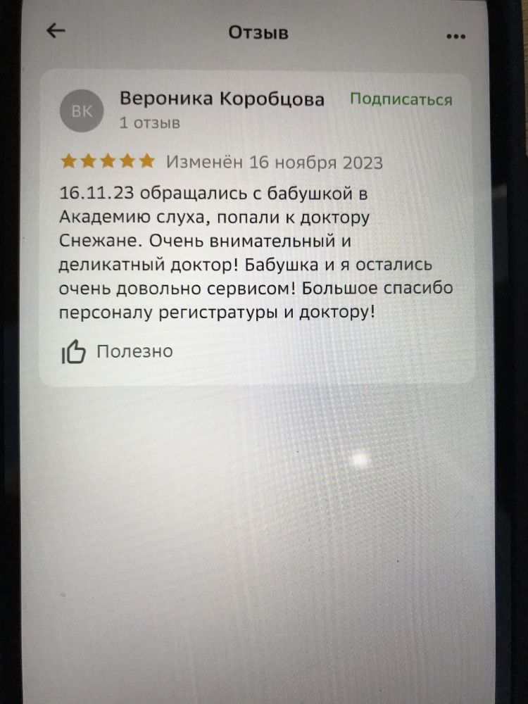 16.11.2023 обращались с бабушкой в «Академию слуха», попали к доктору Снежане. Очень внимательный и деликатный доктор! Бабушка и я, остались очень довольны сервисом! Большое спасибо персоналу регистратуры и доктору!