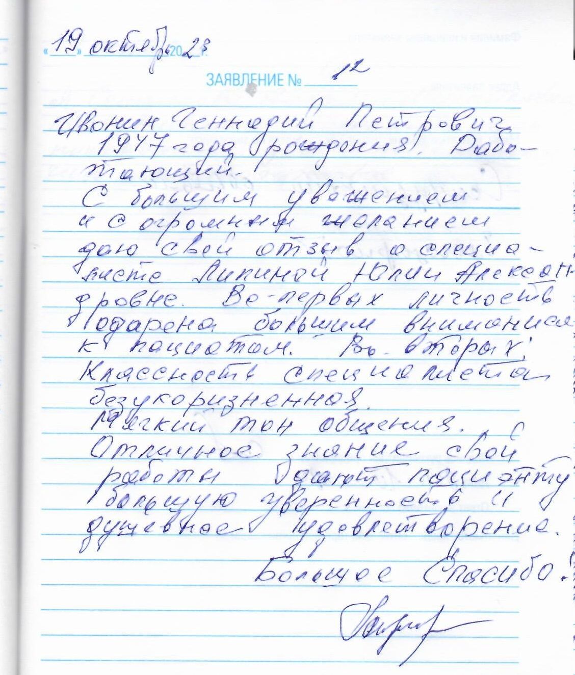 Ивонин Геннадий Петрович 1947 года рождения, работающий. С большим уважением и с огромным желанием даю свой отзыв, о специалисте Липиной Юлии Александровне. Во первых личность одарена большим вниманием к пациентам, во вторых: классность специалиста безукоризненная. Мягкий тон общения. Отличное знание своей работы дают пациенту большую уверенность и душевное удовлетворение. Большое спасибо.